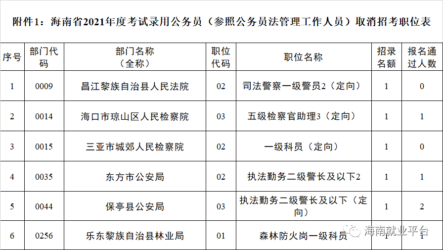 取消招考职位、核减招考名额及改报职位公告!海南省2021年度考试录用公务员公告