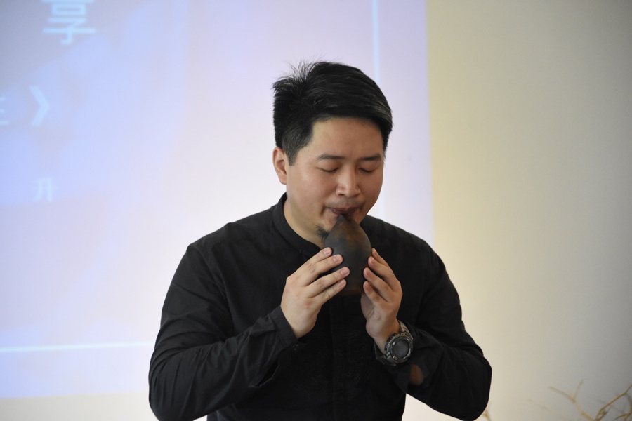 徐升老师作《笛萧埙与养生》的分享,通过讲述他幼时因病而从事音乐学习的经历,肯定了音乐改善健康的作用。接下来,徐老师分别演奏了埙、笛、萧三种乐器,让现场的师生们感受音乐振荡内心世界的美妙。