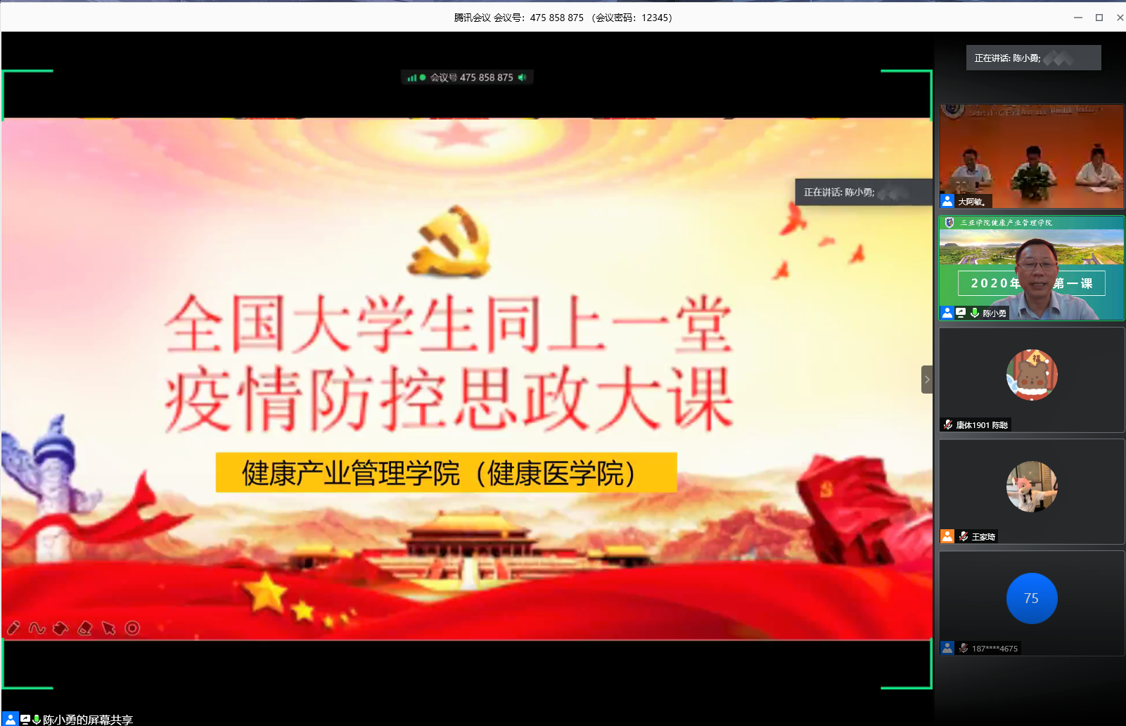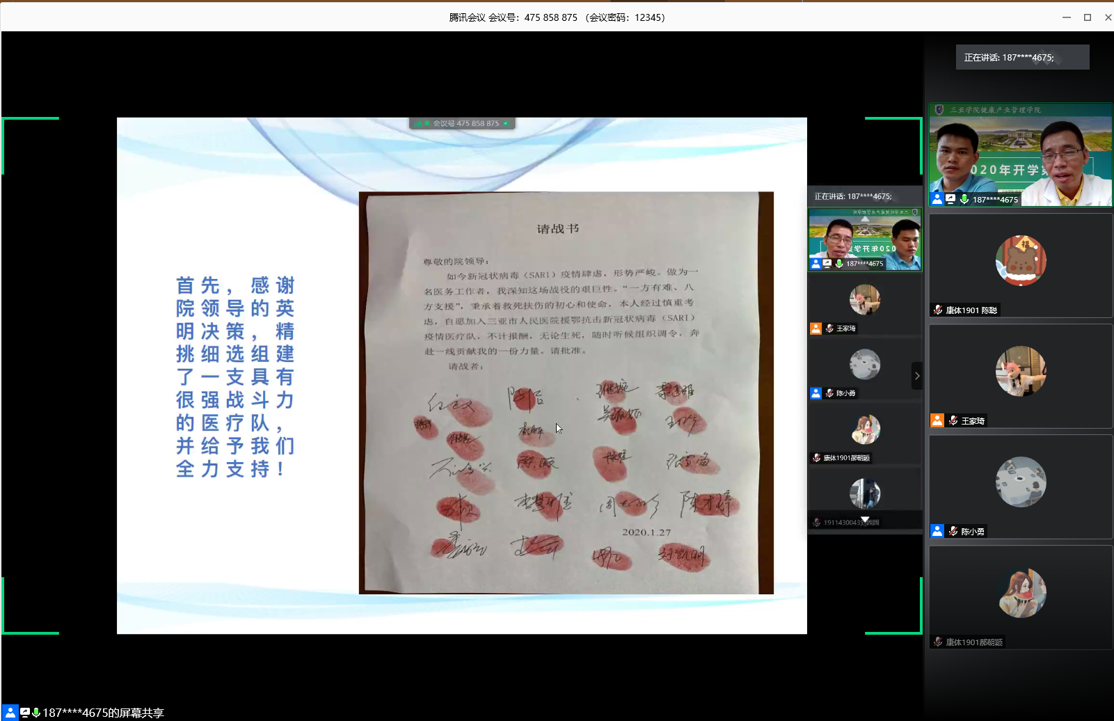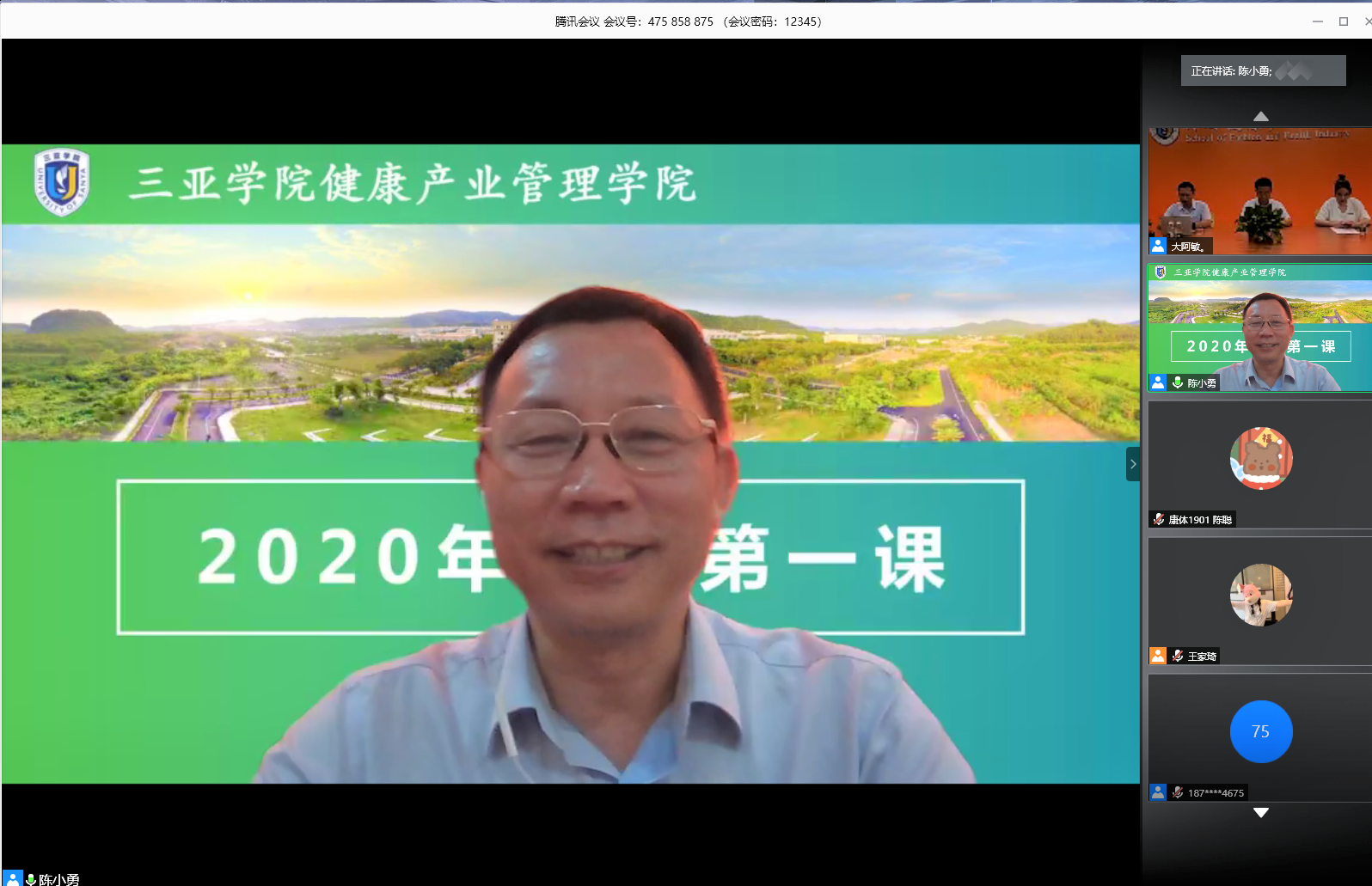 转眼间已是由春入夏,又是一年凤凰花开的时节,在这个特殊时期,在社会各界与全校师生的共同努力下,同学们迎来了返校,随着学生的陆续到来,校园恢复了往昔的青春活力。健康产业管理学院始终不忘初心,以爱国教育为核心,于2020年5月21日14时,通过腾讯会议平台开启“开学第一课”活动。会议由健康产业管理学院党总支部副书记李卉妍教授主持,参与本次会议的嘉宾有健康产业管理学院院长陈小勇教授、健康产业管理学院学术委员会主任温春阳教授,健康产业管理学院除毕业生外全体师生。并邀请到战“疫”英雄三亚市人民医院呼吸内科副主任医师王彬、三亚市人民医院创伤中心、骨显微外科护士长林贝分享他们的感人事迹。
