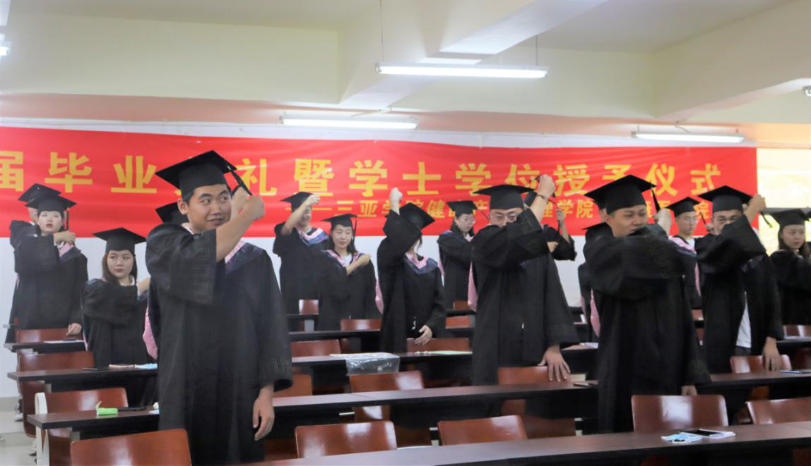 伴随着三亚学院校歌响起,由温春阳教授主持,陈小勇教授引领全体同学举行学位授予仪式。流苏从帽檐的右边滑向左边,标志着同学们正式获得属于自己的学士学位,更重要的是,从今以后,同学们正式步入社会,走向工作岗位,为社会做出贡献。