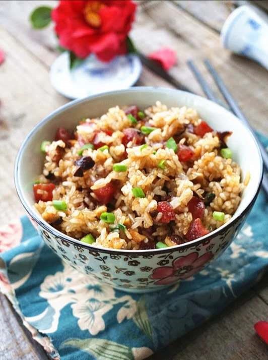 广州小寒传统吃食。早上吃糯米饭,为避免太糯,一般是60%糯米40%香米,把腊肉和腊肠切碎,炒熟,花生米炒熟,加一些碎葱白,拌在饭里面吃。老少皆宜,其味无穷。