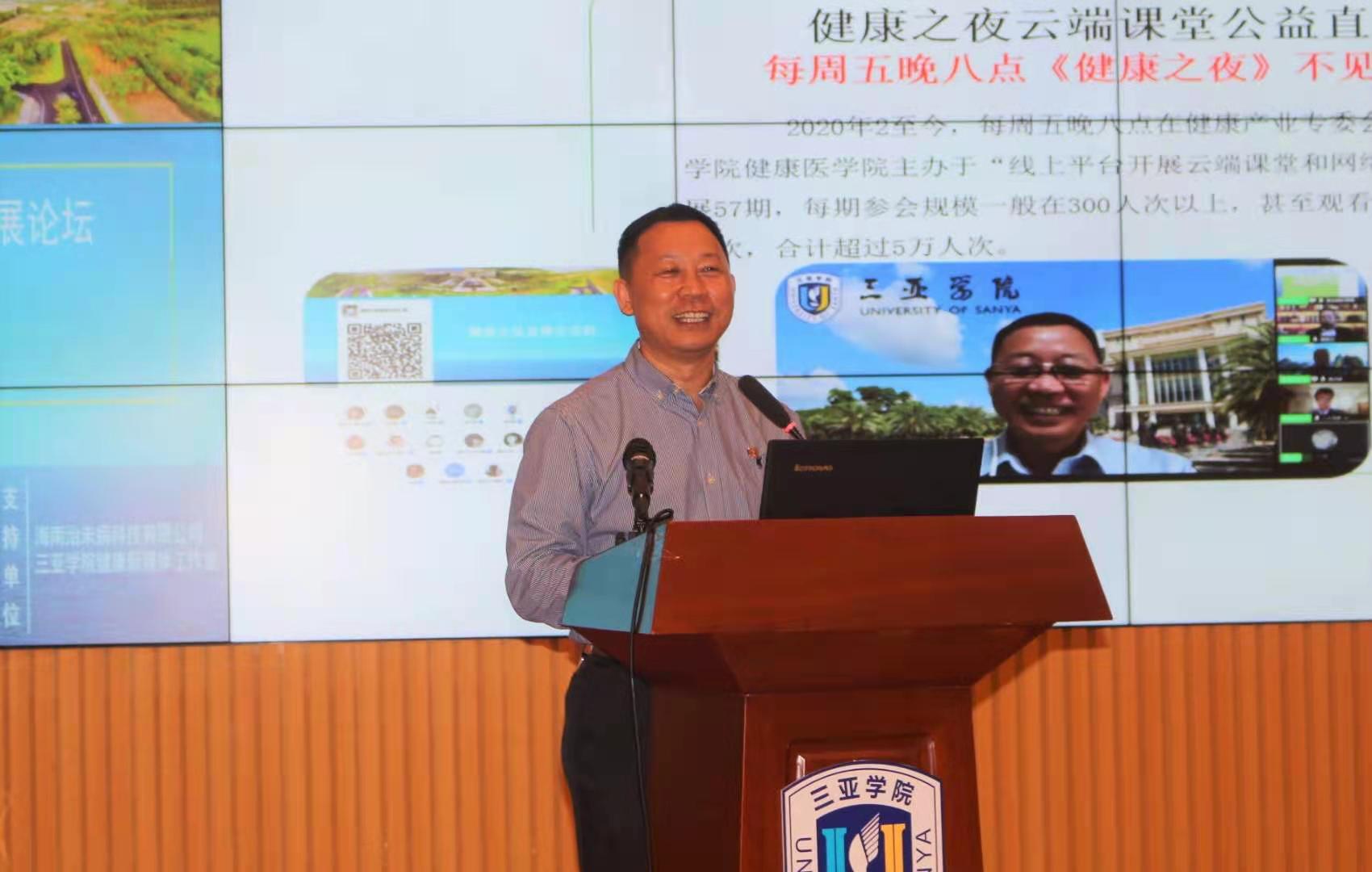 接下来陈小勇教授为健康产业专委会和健康产业创新发展做出工作报告,三亚学院响应国家、海南省大力推进健康产业发展的需求,致力打造健康产业人才培养的特色高地,建设以健康为核心的学科专业群、以新医科理念构建医学学科专业群,引领对接产业和社会尤其是海南建设自由贸易港的区域需求支撑,对此开展人才培养、科学研究及社会实践活动。