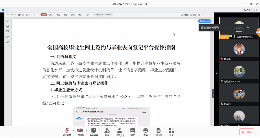 首先,张秀平老师根据《全国高校毕业生网上签约与毕业去向登记平台操作指南》毕业生们进行线上指导,并针对“未签就业协议 申请签约”、“已签就业协议 登记信息”和“无需就业协议 去向登记”三种情况进行详细讲解。