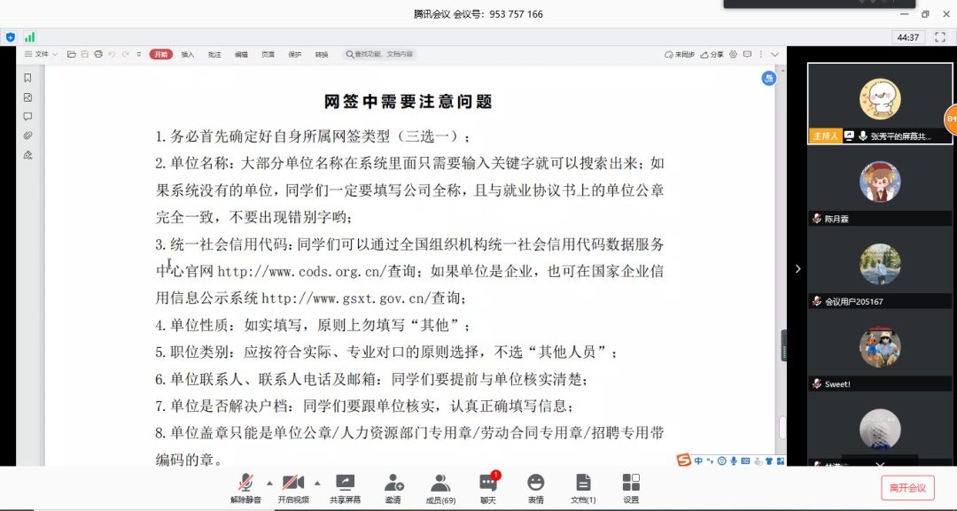 随后,张秀平老师深入讲解了签约中需要注意的问题,强调“单位名称要与公章上的名称一致,网上填写时也要注意;”、“组织机构代码(企业工商注册号)可以从天眼查等网站查询,协议书上的要填写好后扫描成图片,再进行上传;”、“部分企业的统一社会信用代码(网上填写需要)与组织机构代码——企业工商注册号(就业协议书填写需要)不一样,可通过天眼查等网站查询后再进行网上填写。”这三点尤为重要,不可随意疏忽。