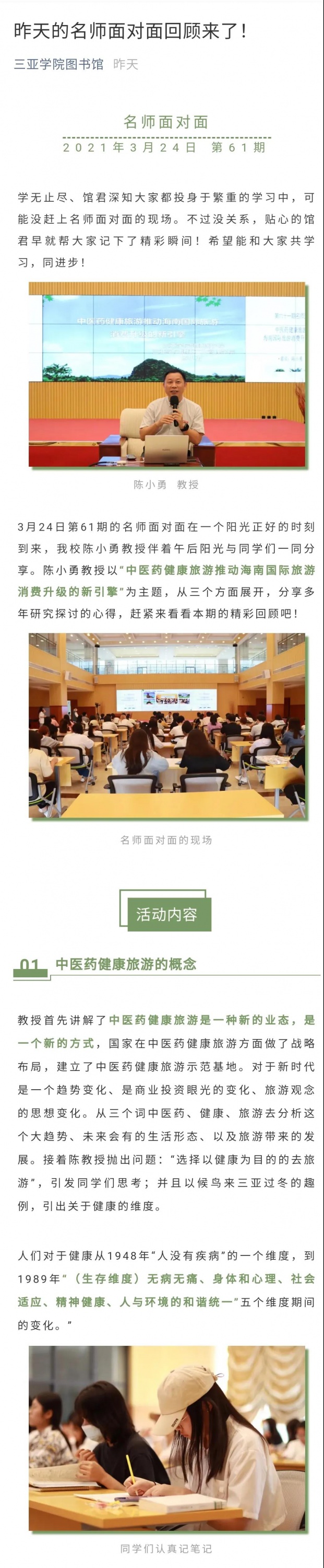 2021年3月24日下午4点,名师面对面第61期在书山馆中报告厅顺利开讲。本次邀请到三亚学院健康产业管理学院院长陈小勇教授与大家探讨“中医药健康旅游与海南国际旅游消费的联动作用”,共有90余名同学参加。