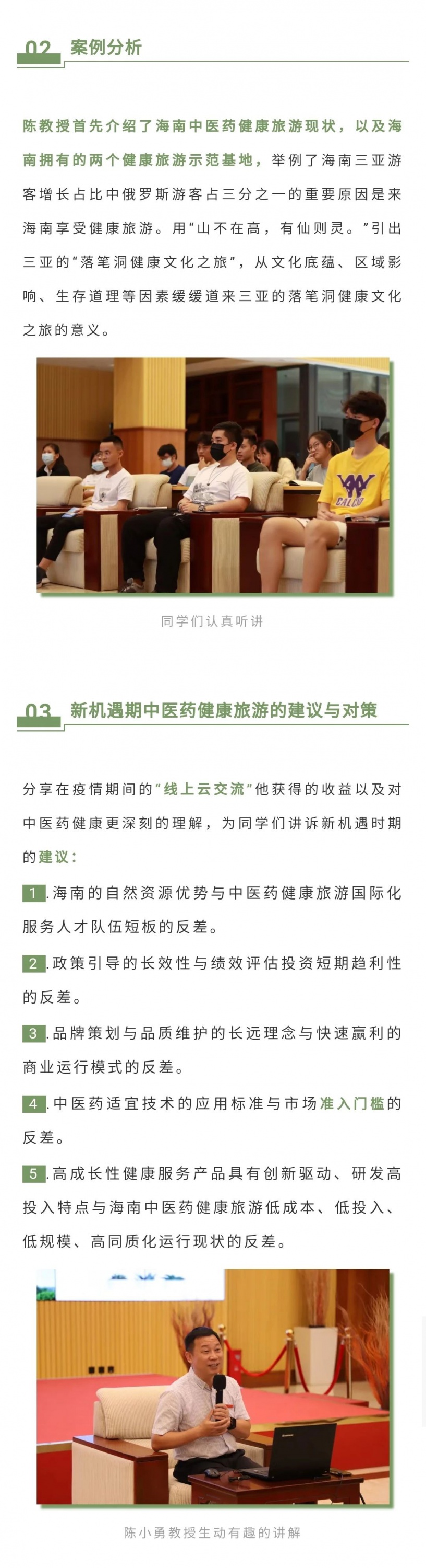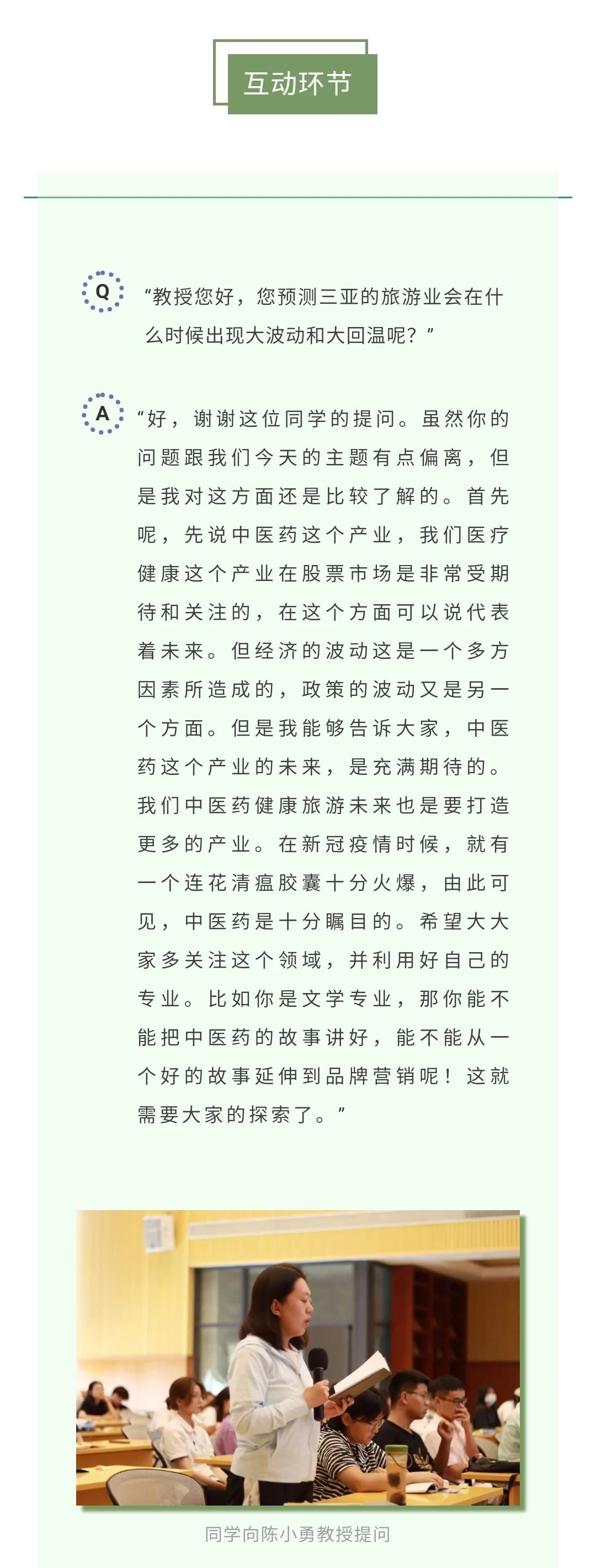 最后陈教授与同学们分享了在疫情期间的“线上云交流”获得的收益及对中医药健康更深刻的理解,为同学们讲诉新机遇时期,海南的自然资源优势与中医药健康旅游国际化服务人才队伍短板、政策引导的长效性与绩效评估投资短期趋利性、品牌策划与品质维护的长远理念与快速赢利的商业运行模式等五点建议。