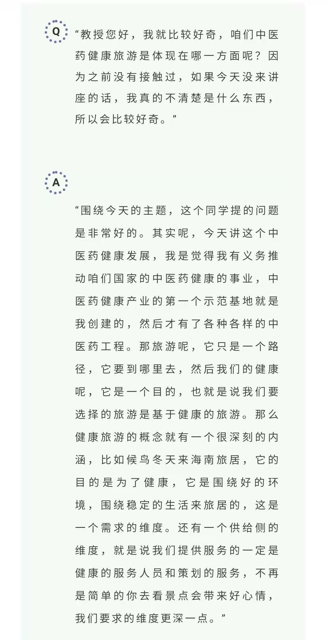 陈教授开篇讲述中医药健康旅游是一种新的业态,对新时代是趋势变化、是商业投资眼光变化、旅游观念思想变化。接着从中医药、健康、旅游去分析趋势、未来的生活形态、及旅游发展。同时提出问题:“选择以健康为目的的去旅游“,引发同学们思考;并且以候鸟来三亚过冬的趣例,引出关于健康的维度定义。