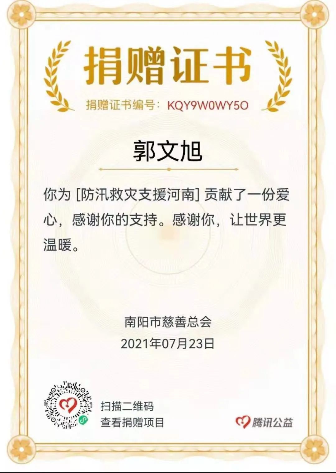 我们常说,中国人民在困难面前是心连心。无论是抗日战争,还是抗疫阻击战的胜利都展现着这个民族的团结与韧性,而作为这个民族的一份子,我有义务为她贡献出自己的一份力量。虽然我无法像英雄们一样,现场感受洪水的恐怖,但是我会在后方密切关注着事情的发展,并向灾区贡献了一份爱心。也许一个人的力量有些微薄,但众志成城,这份爱心一定会化作磅礴之力。