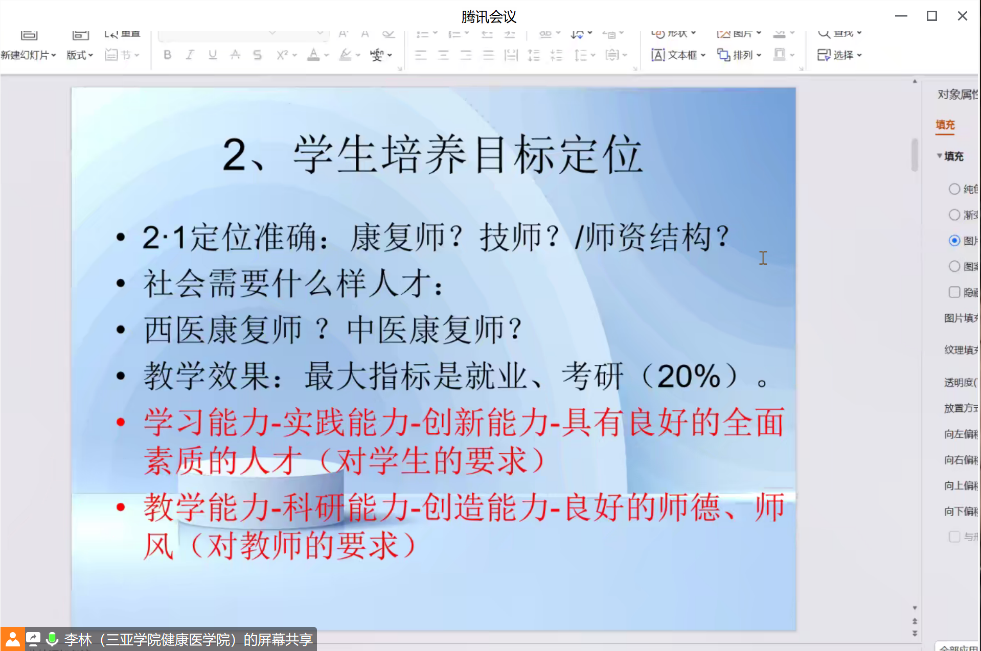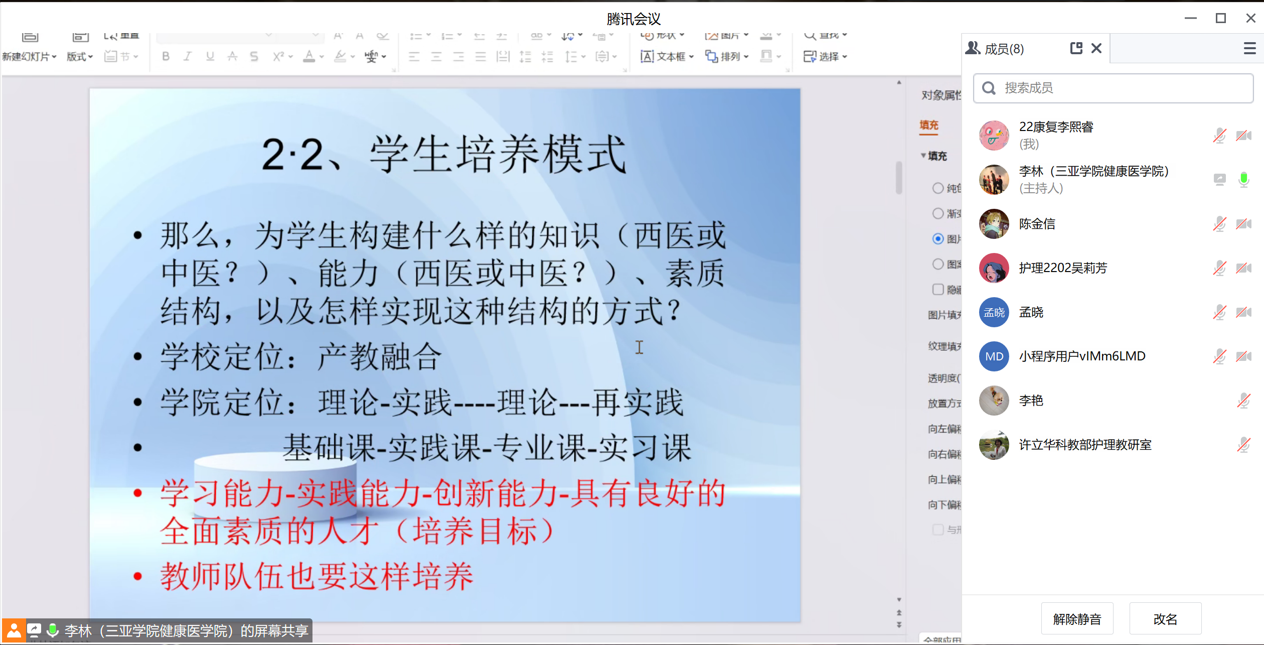 为了更进一步推进康复治疗学产教融合和培养出创新型人才,2023年8月21日晚8点整健康医学院/健康产业管理学院李林教授为老师和同学们讲解产教融合与课程设计的相关内容。