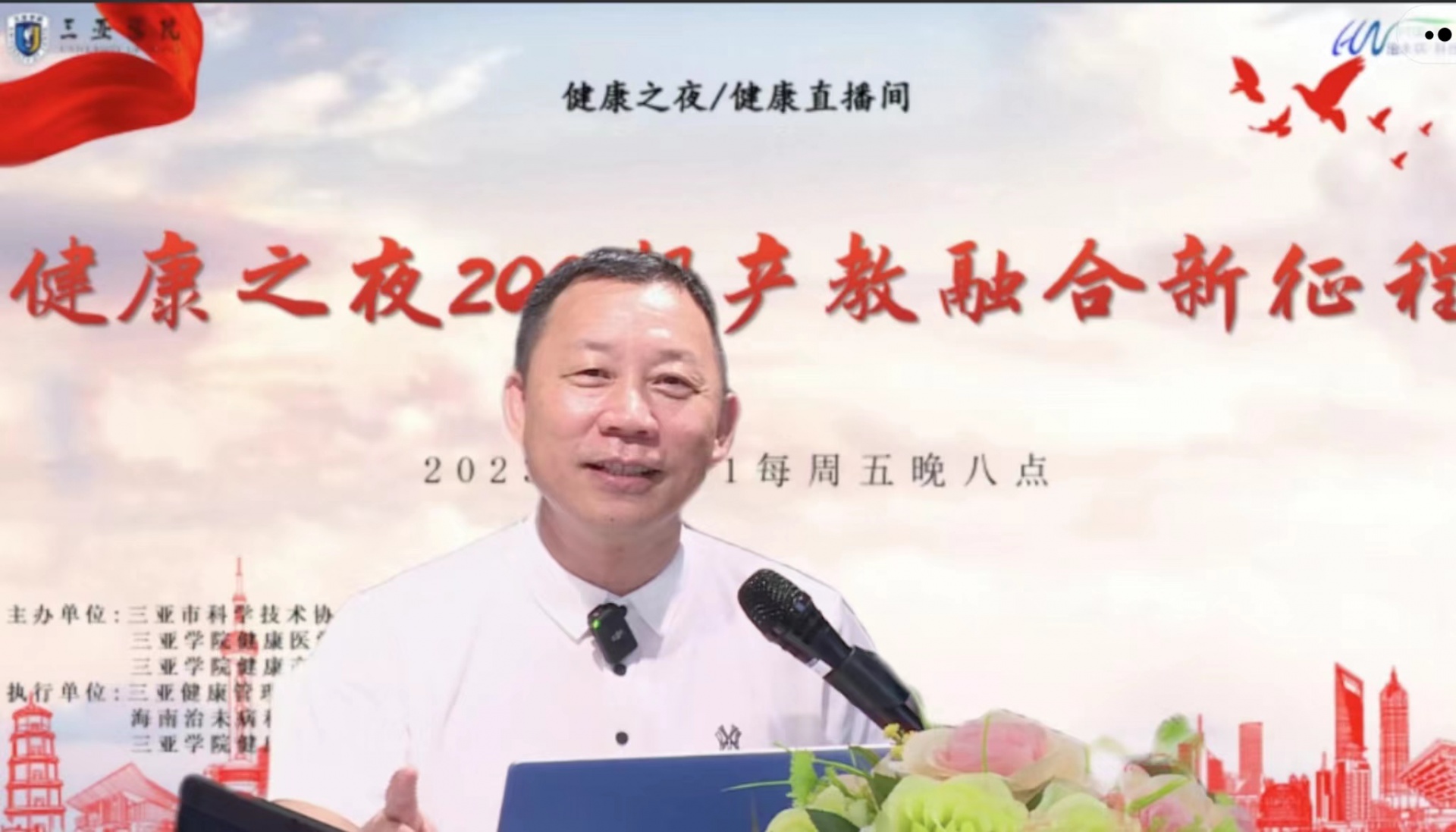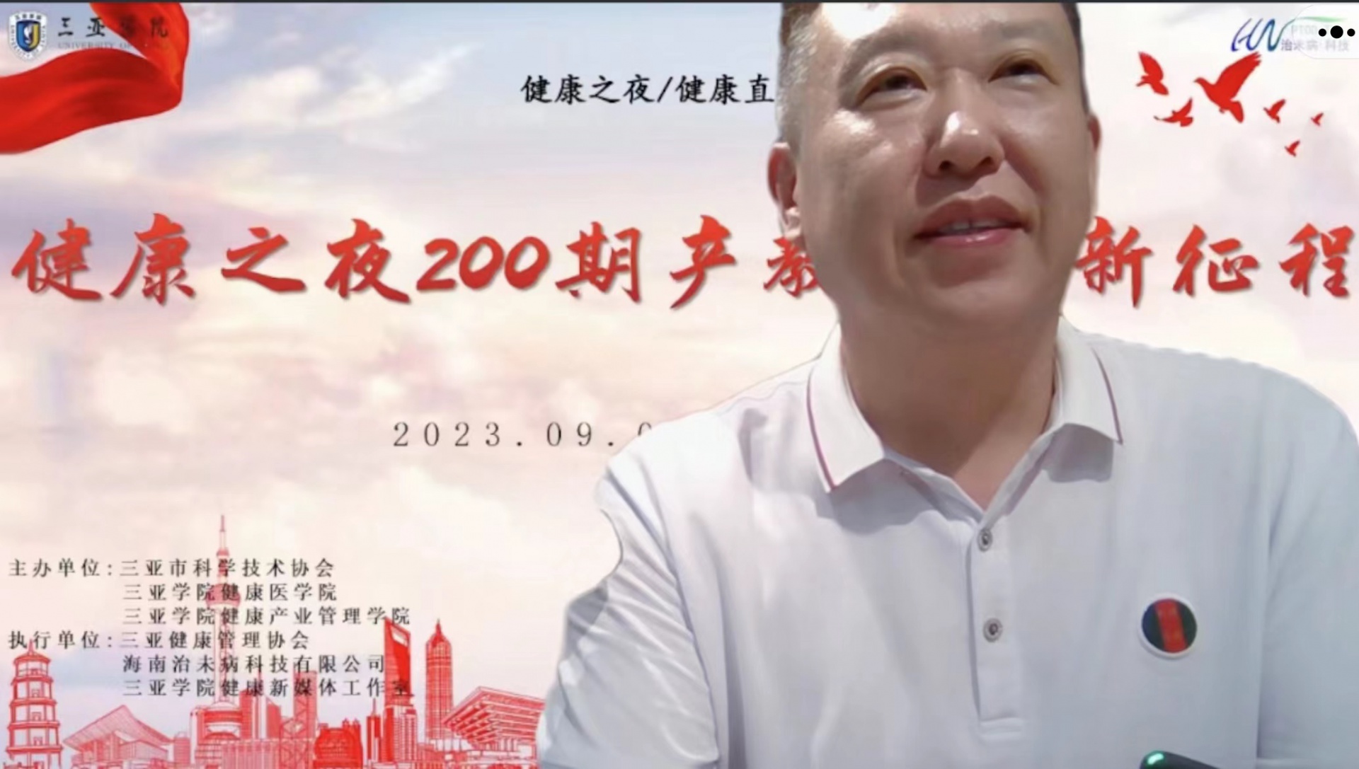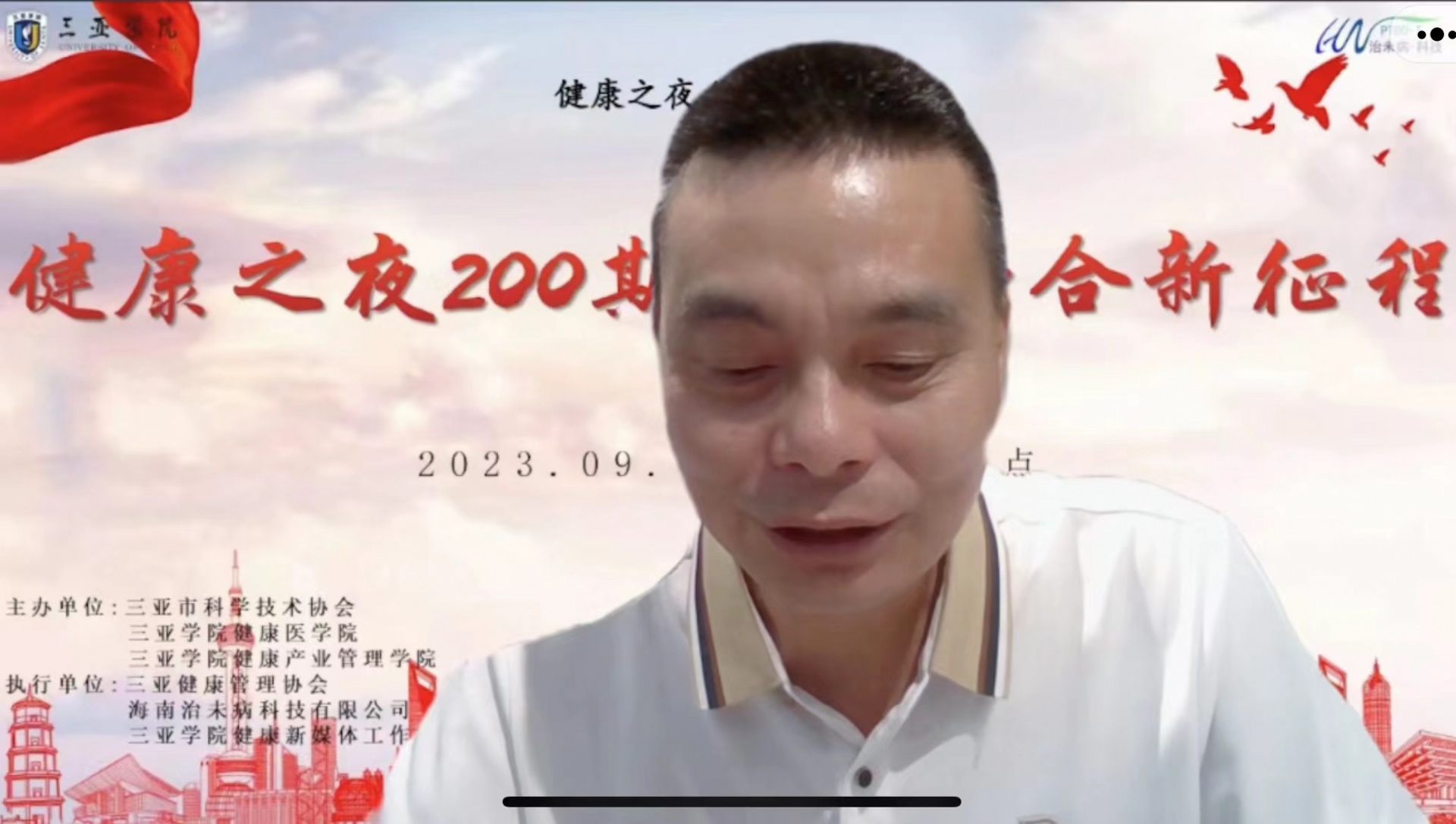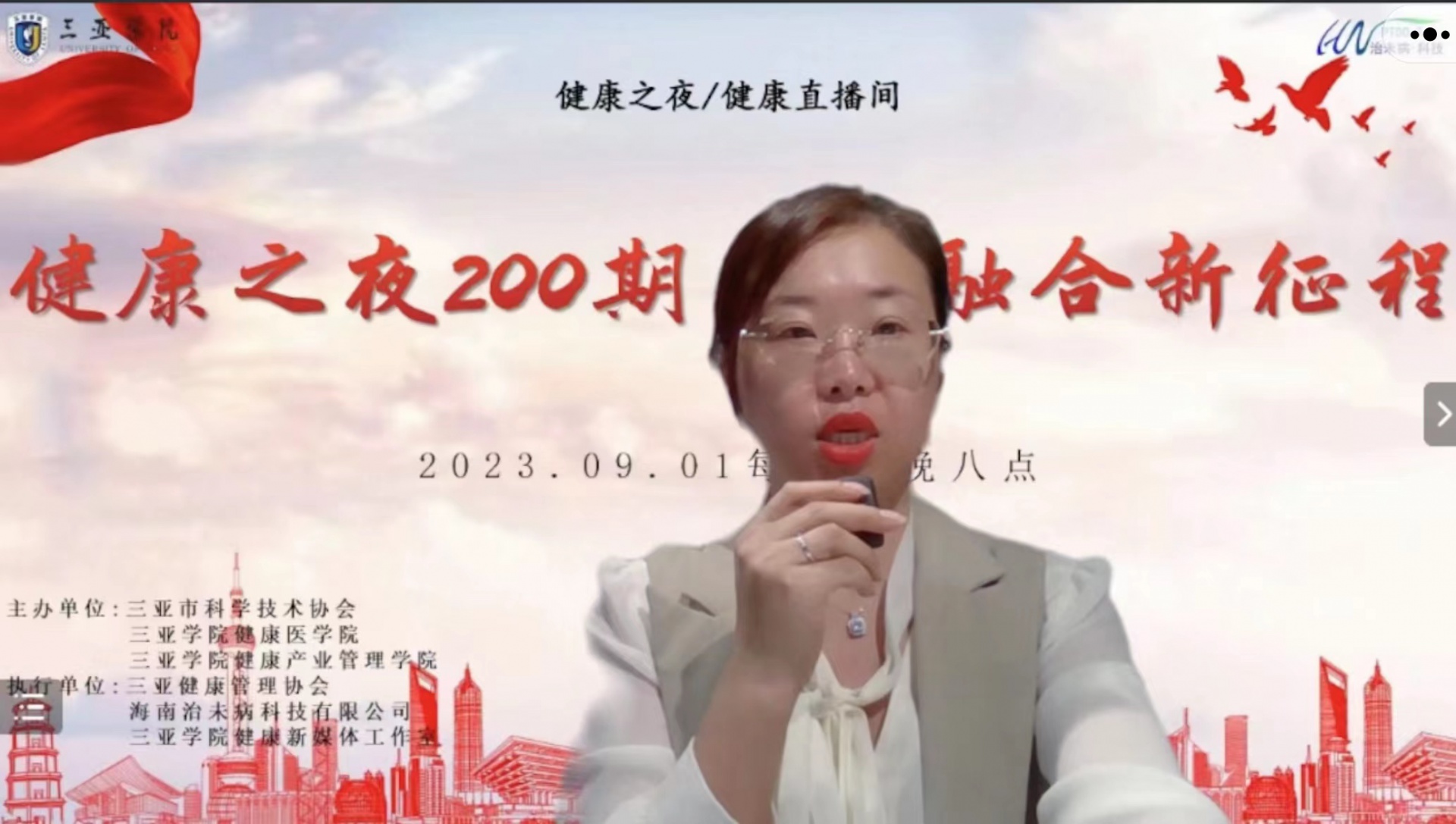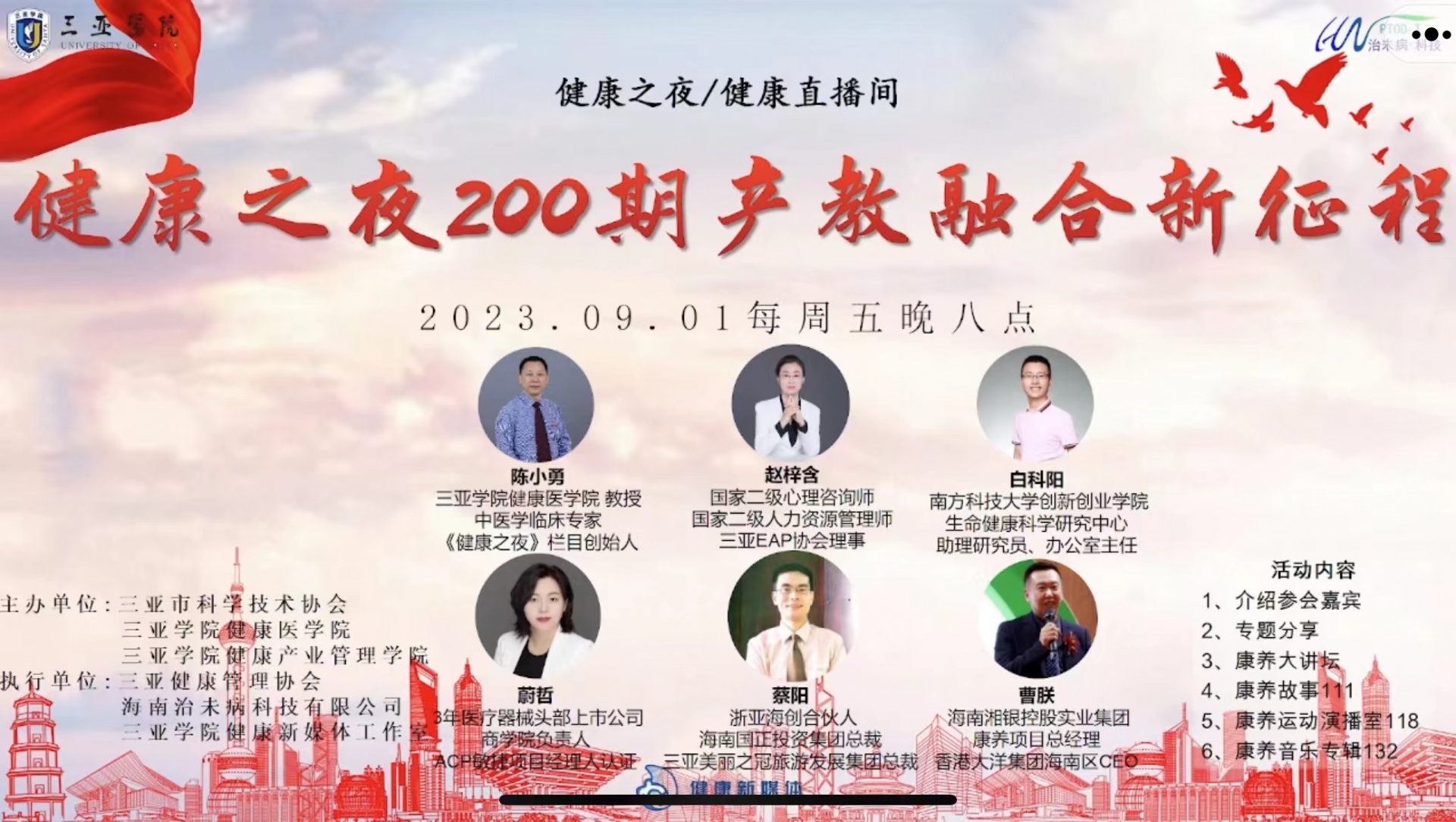 2023年9月1日晚20点健康医学院/健康产业管理学院在线开展了以“健康之夜200期产教融合新征程”为专题的健康之夜活动。本次活动由三亚学院、中国健康促进与教育协会健康产业专业委员会、中国中医药研究促进健康旅游分会指导;三亚学院健康医学院、三亚学院健康产业管理学院、三亚市科协、三亚健康管理学会、三亚学院康养产业学院、三亚学院健康新媒体;海南治未病科技有限公司、三亚学院健康管理中心、三亚学院音乐康养工作室、三亚学院康养运动队支持。本次活动邀请了健康产业管理学院教授,中医学临床专家,《健康之夜》栏目创始人陈小勇教授。国际二级心理咨询师,国家二级人力资源管理师,三亚EAP协会理事,赵梓含老师。南方科技大学创新创业学院,生命健康科学研究中心,助理研究员,办公室主任,白科阳主任。海3年医疗器械头部上市公司,商学院负责人,ACP敏捷项目经理人认证蔚哲女士。浙亚海创合伙人,海南国正投资集团总裁,三亚美丽之冠旅游发展集团总裁蔡阳先生。海南湘银控股实业集团,康养项目总经理,香港大洋集团海南区CEO曹联先生。