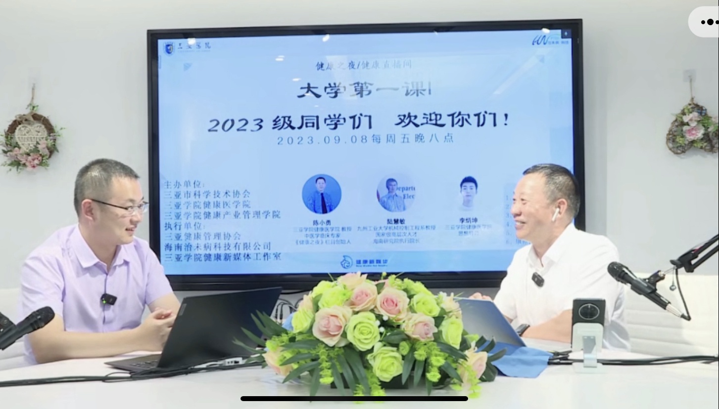 2023年9月8日晚20点健康医学院/健康产业管理学院在线开展了以“大学第一课|2023级同学们 欢迎你们”为专题的健康之夜活动。本次活动由三亚学院、中国健康促进与教育协会健康产业专业委员会、中国中医药研究促进会健康旅游分会指导;三亚市科协、三亚学院健康医学院|健康产业管理学院联合主办、三亚健康管理协会、海南治未病科技有限公司、三亚学院健康新媒体联合执行;三亚学院健康管理中心、三亚学院音乐康养工作室支持。本次活动出席嘉宾三亚学院健康医学院专家,中医学临床专家,《健康之夜》栏目创始人陈小勇教授。九江工业大学机械控制工程系教授,国家高层次人才,海南研究院执行院长,陆慧敏教授。三亚学院健康医学院思想导师,李炳坤老师。