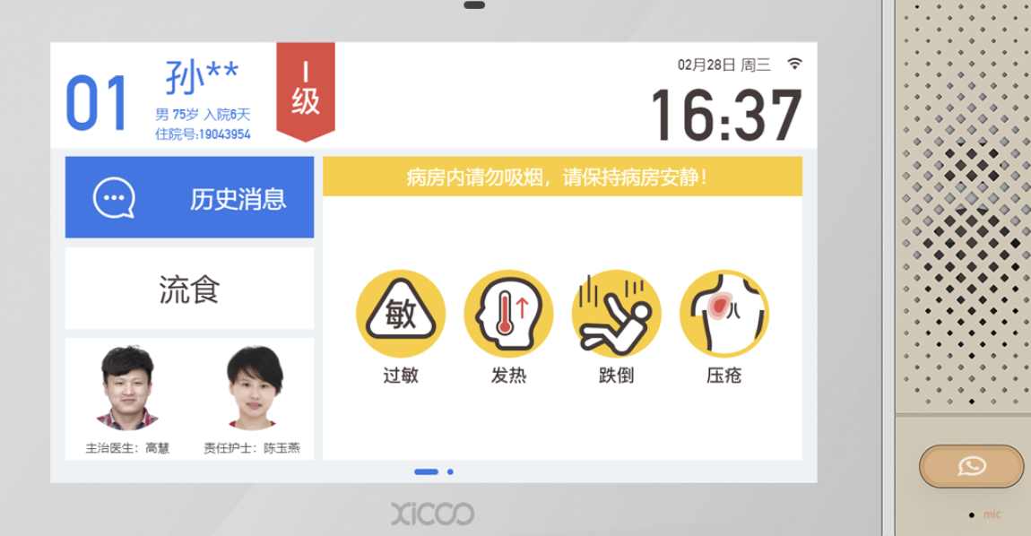 现在医院老年病人非常多,护理安全也格外重视,在护理大屏上就可以非常清晰可以看到哪些老人需要特别的安全防护,比如插有导尿管、氧气管、鼻饲、留置针需要防止跌倒坠床等事项都分门别类的标注在大屏幕上。