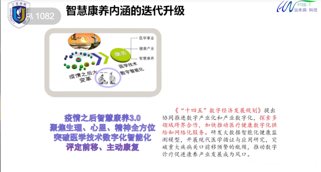在此,陈教授祝贺大家中秋佳节,国庆之时健康并快乐着,并提到我们可能会碰到的一些案例,在上课的过程中或许会发生突发情况,比如心梗,那么这种情况能不能有效的救治非常重要,更重要的是能不能提前的预防,尤其是新冠后综合症,一系列的器官的这种影响,有没有办法解决,在这里呢,陈教授给大家做了一些分享。首先,我们要看到疫情过后,这个康养人的对健康的需要是要进入的一个智慧康养的新时代,我们在这个国家十四五数字经济发展规划里面特别提出了要探索多领域跨界合作,加速推动医疗健康数字化供给和网络化的服务,也就是数字健康,数字康养,数字诊疗这一系列的跨学科。跨界合作的这个领域备受关注,尤其在我们海南自贸港建设,我们这种安养就是要进入到身心灵多个路径,这是一个形成模式的,这个突破也是这认知放肆的跃迁。在这里面,就非常重点关注到了我们健康科技的创新,重点就是能够动态四化、实时。
