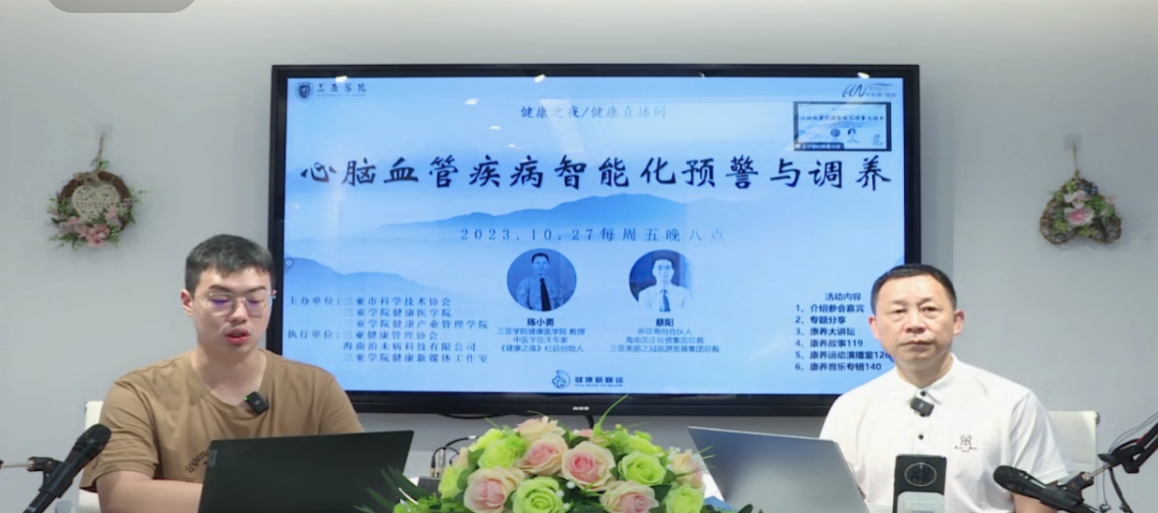 2023年10月27日晚20点健康医学院/健康产业管理学院在线开展了以“心脑血管疾病智能化预警与调养”为专题的健康之夜活动。本次活动由三亚学院、中国健康促进与教育协会健康产业专业委员会、中国中医药研究促进会健康旅游分会指导;三亚市科协、三亚学院健康医学院|健康产业管理学院联合主办、三亚健康管理协会、海南治未病科技有限公司、三亚学院健康新媒体联合执行;三亚学院健康管理中心、三亚学院音乐康养工作室支持。本次活动出席嘉宾三亚学院健康医学院专家,中医学临床专家,《健康之夜》栏目创始人陈小勇教授。浙亚海创合伙人、海南国正投资集团总裁、三亚美丽之冠旅游发展集团总裁蔡阳老师。