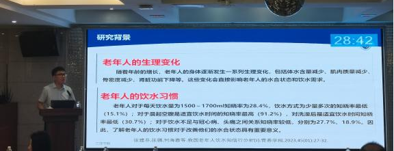 我院教师林国天就以“三亚市老年人饮水行为及水合状态与生物标记物的相关性研究”为题,向各位参会代表做分享。目前老年人饮水量、水合状态与健康相关的研究尚不足,同时老年人适宜水摄入量应等同于还是低于成年人存在不一致,和我国缺乏65岁以上老年人的饮水行为调查数据,因此有必要开展老年人饮水行为调查,并进一步探索老年人饮水行为、水合状态与健康的关系,提高公众对水重要性的认识,为制定老年人适宜水摄入量提供参考数据和证据,促进居民足量饮水并形成健康饮水行为,进而促进机体健康。