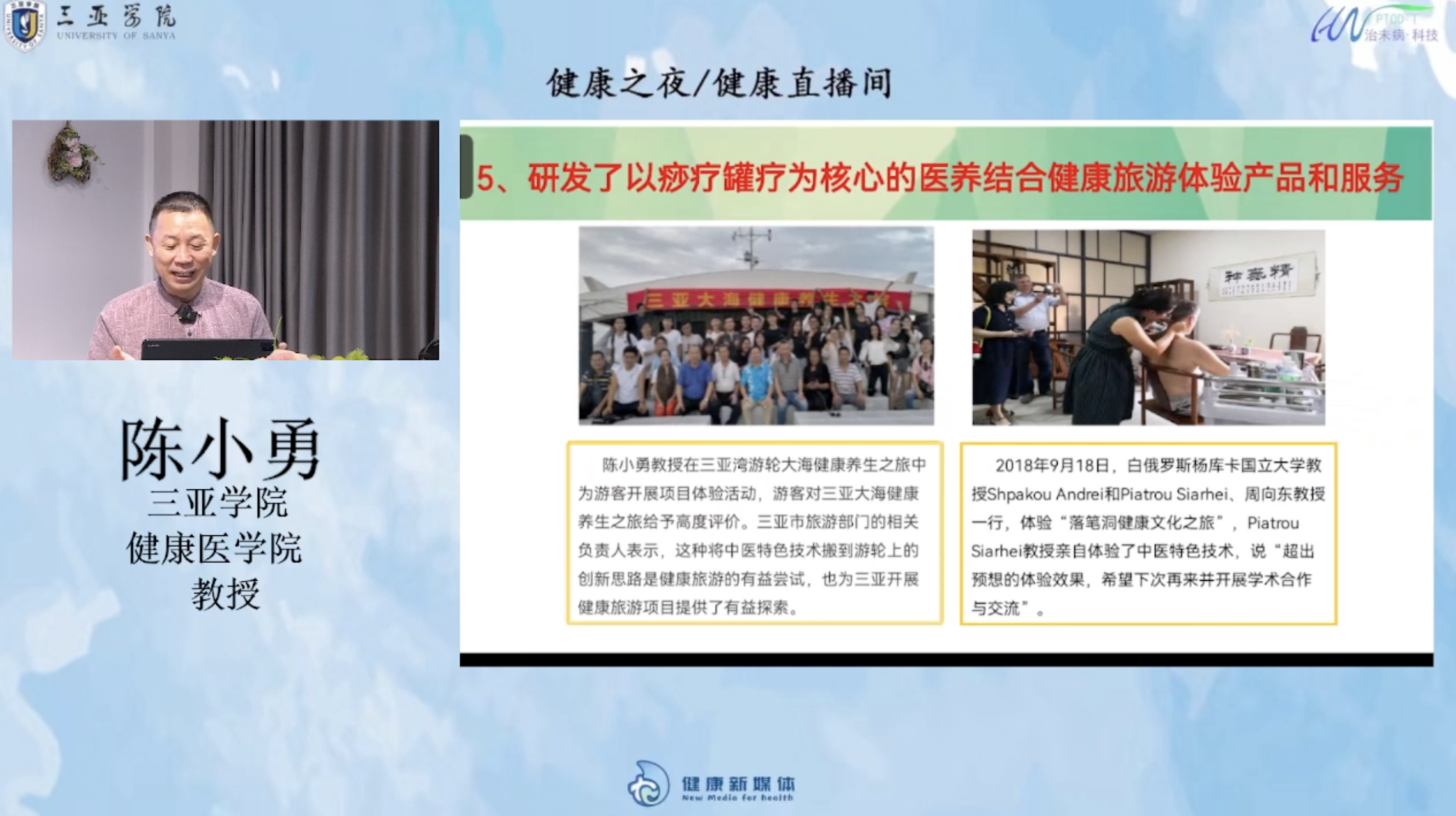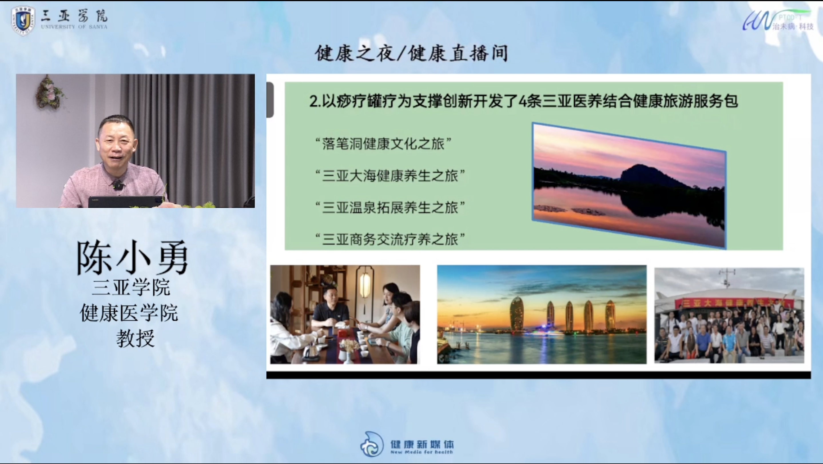 健康之夜栏目创始人陈小勇教授本期主要进行了“三亚地区医养结合健康旅游项目研发报告”的主题讲座。陈小勇教授从项目目标、项目成果、成果转化、经验体会四方面进行报告。