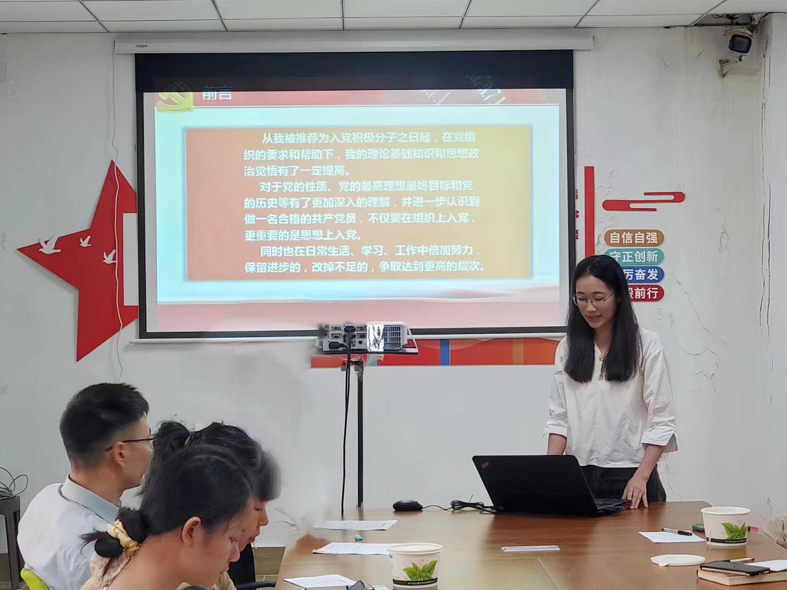 李静茹老师表示,张予菲同志能积极向党组织靠拢,思想积极向上,做事踏实稳重,自律勤奋,同意张予菲同志被吸收为预备党员。