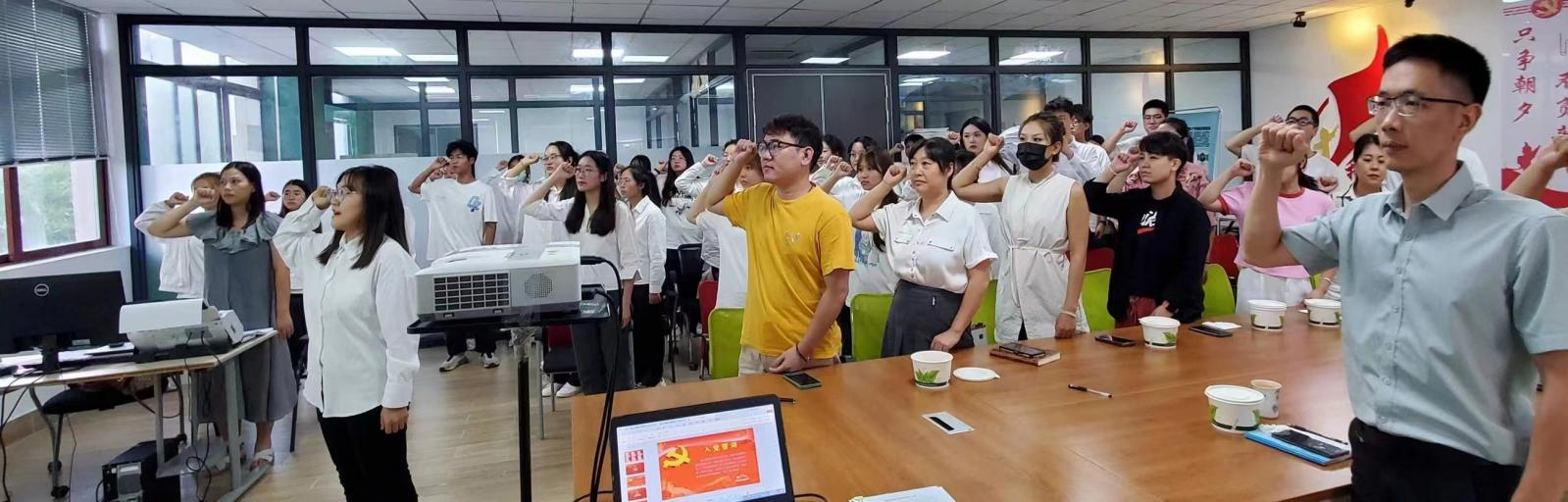 会议第六项议程 全体起立,进行入党宣誓