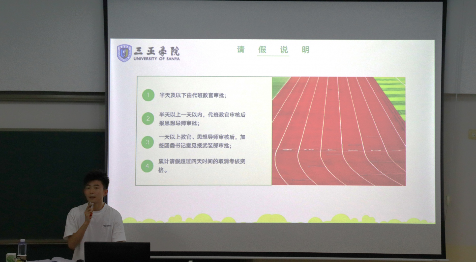 会议中,李炳坤老师用PPT展示的形式,向大家说明一些军训相关的注意事项。
