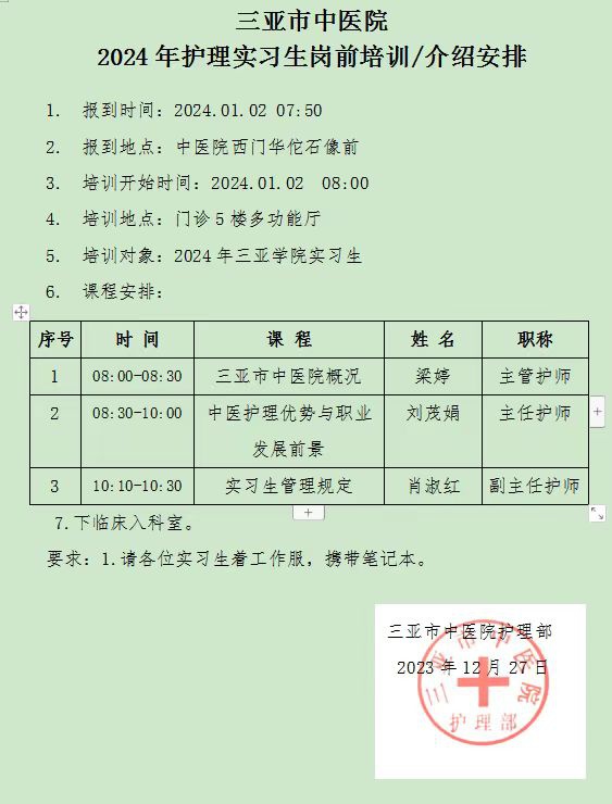 三亚市中医院对健康医学院/健康产业管理学院护理学实习生的培训有以下安排: