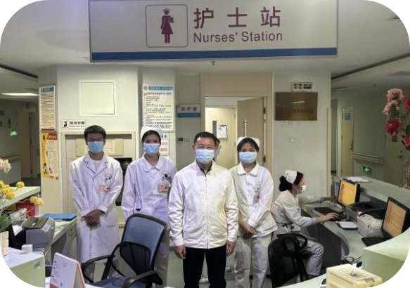 首先来到海口市人民医院看望2020年级的护理学专业实习生,如图1。上午9时进入科室时,同学们正在紧张的工作中,陈小勇教授看到同学们忙碌的身影表示非常欣慰,表示同学们从校园进入医院能够如此快速地进入工作状态难得可贵,同学们辛苦了!从医必然是一条苦路,但我相信我们的康管学子,一定能坚持下去,再接再厉,同学们加油!有任何困难一定要及时向学院反映,虽然同学们不在学校,但请记住,三亚学院、健康医学院永远是同学们的家!