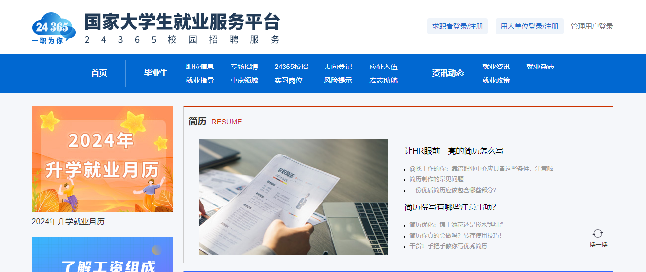 24365国家大学生就业服务平台是由教育部主管,专门用于服务于高校毕业生及用人单位的公共就业服务平台。平台包括招聘信息、就业指导、就业政策等版块,覆盖毕业生求职的方方面面。毕业生同学们可利用假期,充分利用平台为自己加油!