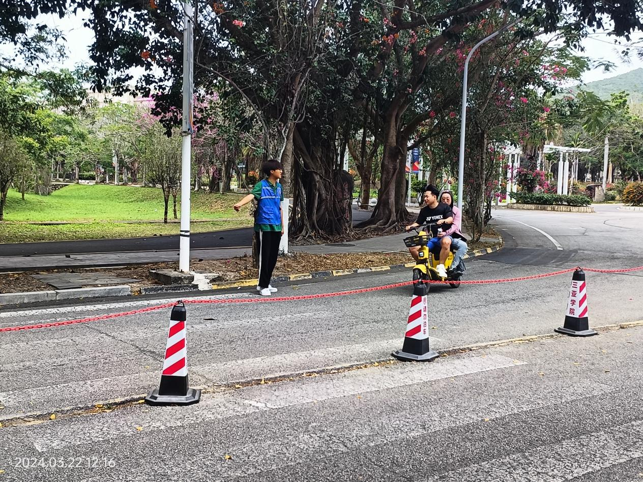 学院思想导师吕灵跟学生会成员一起进行交通督导,维护校园秩序,守护同学们的安全,对违规校园交通的同学进行劝导,重点针对小黄车违规载人及电动车超载、骑车逆行的现象等违法驾驶行为进行道路交通安全教育,切实提高大学生校园交通安全意识。