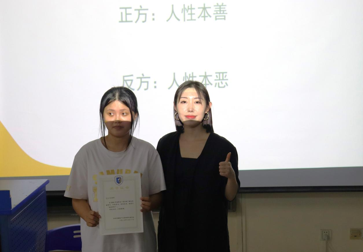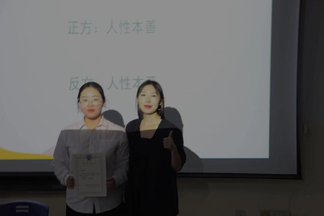(最佳辩手庞侦溶与团委副书记李静茹合影)