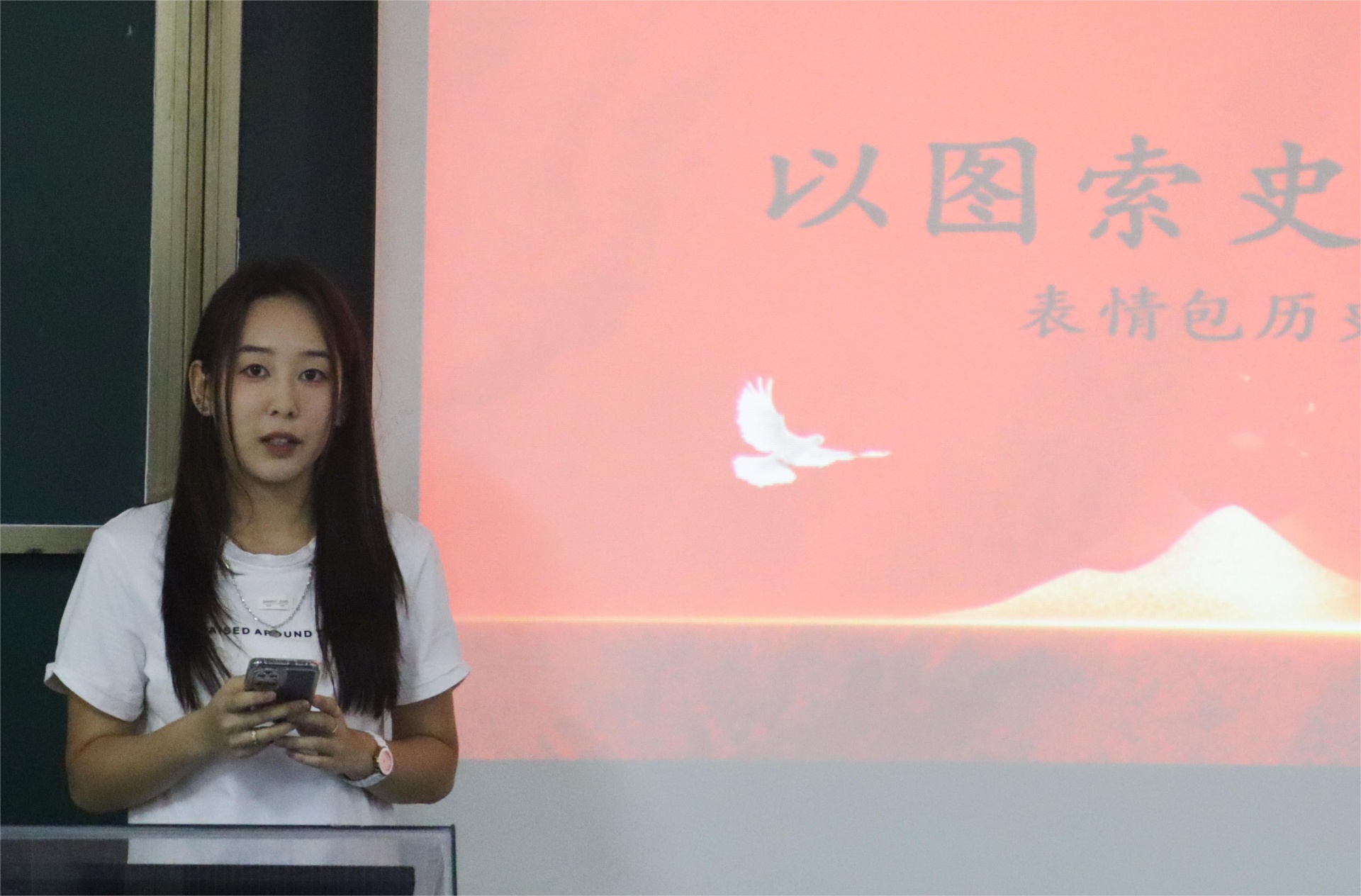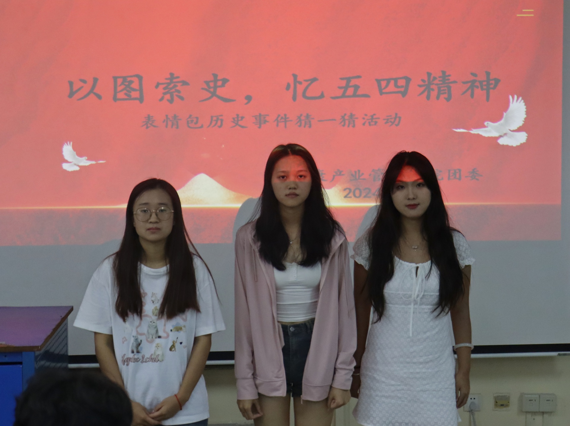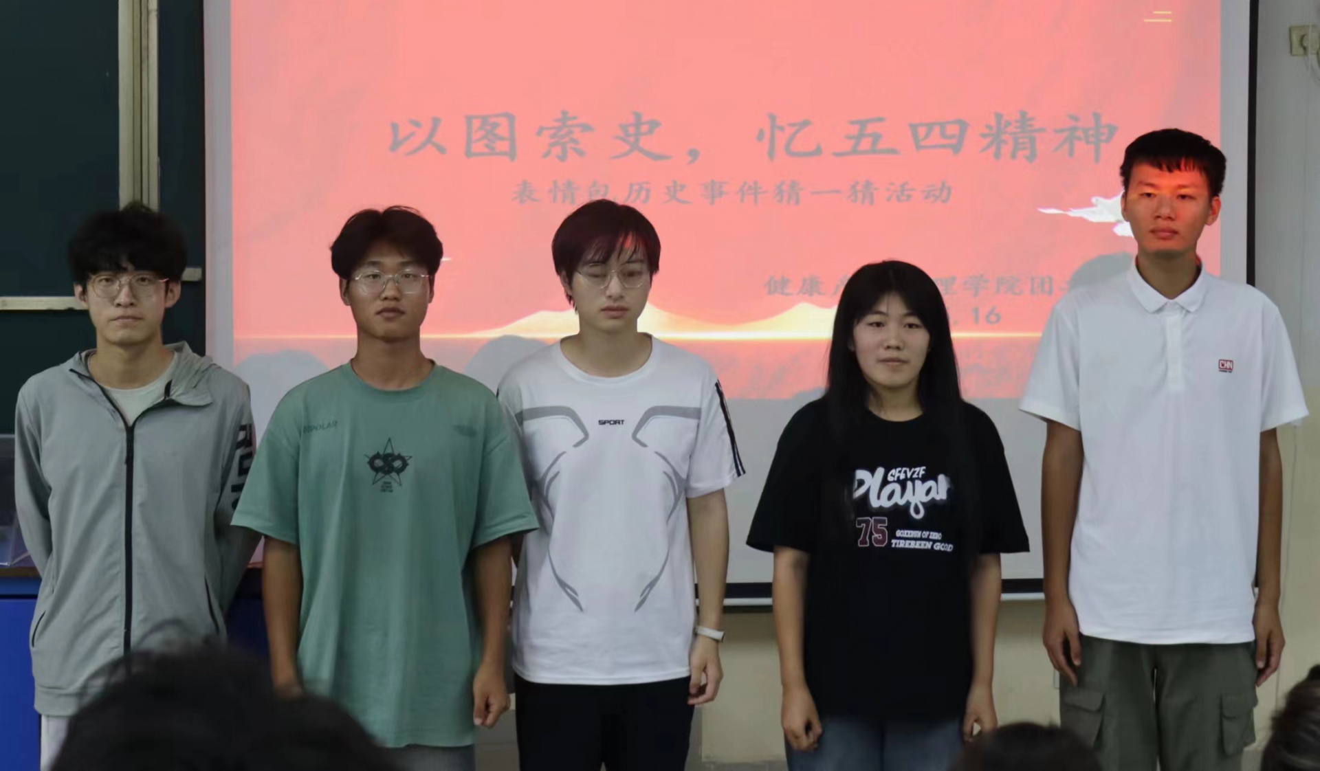 活动开始由主持人介绍活动规则:本次活动以个人为单位参与本次活动,根据显示题目作答,对表情包的动作及神态来猜测五四历史事件名称,根据每个同学作答题目的正确率和速率来判定胜负,并规定比赛期问不能交头接耳,不能用电子产品搜索相关题目信息。