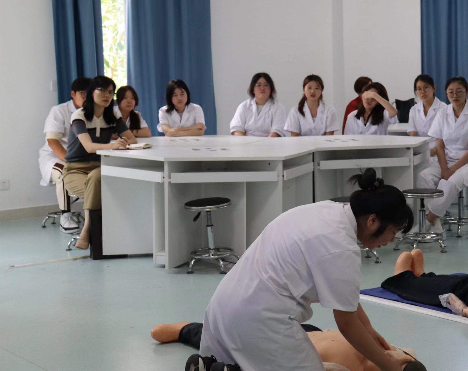 考察过程中,专家考察了实验室心肺复苏课程,检视学生的实际操作,并与学生进行交流,询问具体操作流程与课程知识,考察学生的学习及专业课程设置情况。