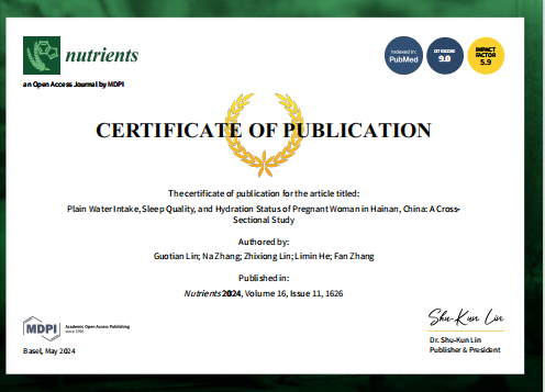 今日,健康医学院/健康产业管理学院医学检验专业教研室与海南医学院张帆教授团队、北京大学张娜研究员团队合作,在中科院二区《Nutrients》(IF=5.9)发表题为:“Plain Water Intake, Sleep Quality, and Hydration Status of Pregnant Woman in Hainan, China: A Cross-Sectional Study”的研究论文。研究提示孕妇的水合状态可能受到日常白水摄入量和睡眠质量的影响,同时中国孕妇的饮水量不足,因此,对孕妇进行充足饮水的教育对她们的健康有益。(原文链接:https://www.mdpi.com/2072-6643/16/11/1626)