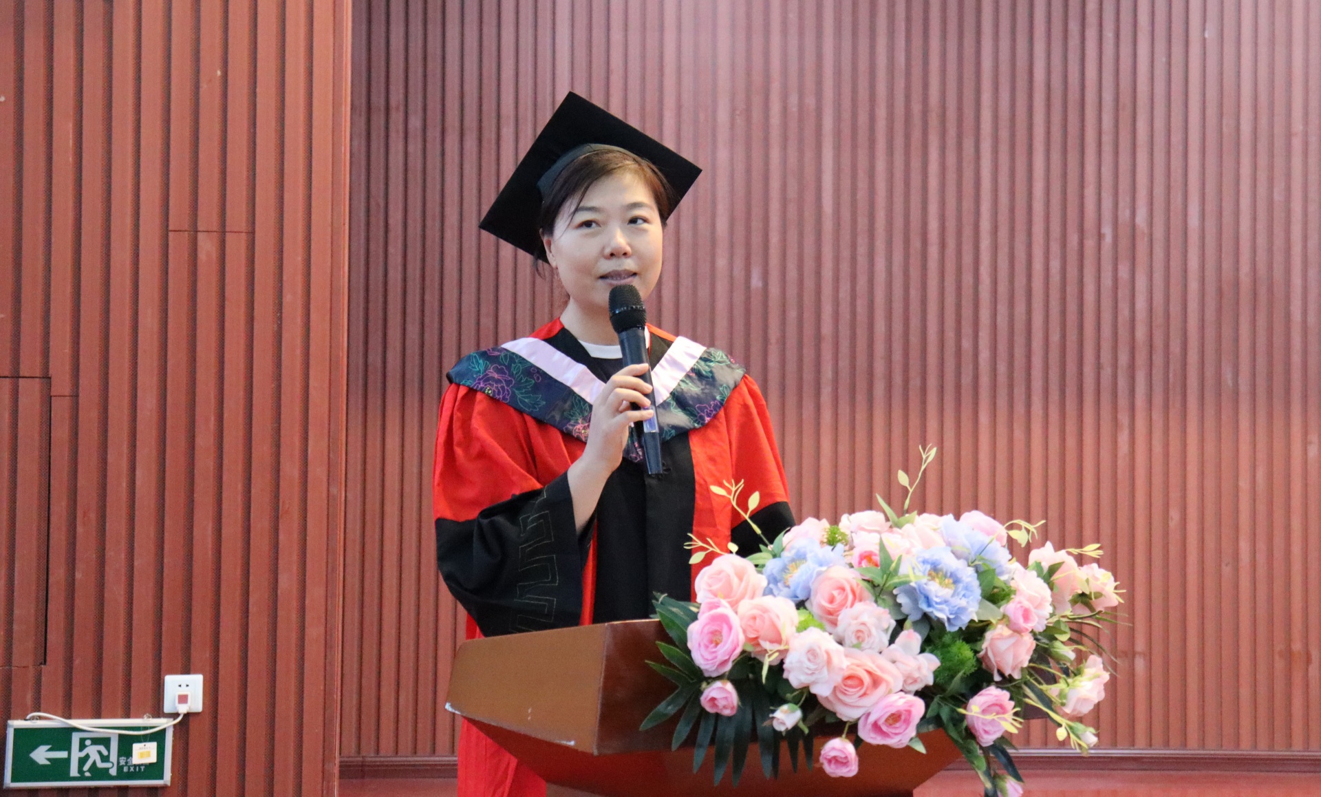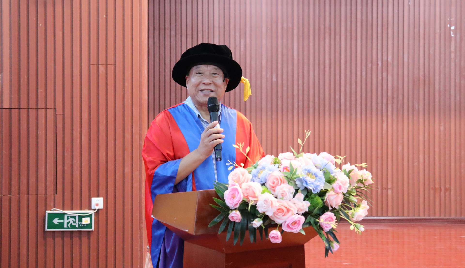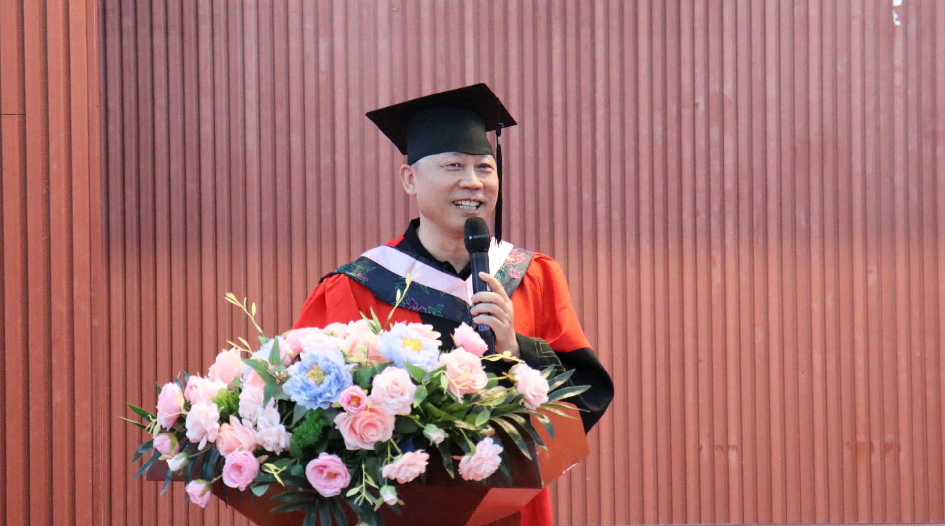 仪式第一项,升国旗,奏唱国歌。在雄壮的国歌声后,陈小勇院长上台致辞,在致辞中,他首先对毕业生们表达了热烈的祝贺,对他们四年来在学业、科研、社会实践等方面的优异表现给予了高度评价,其次鼓励毕业生们要勇于面对未来的挑战,保持对学习的热情和探索未知的精神,希望毕业生们能够用自己的所学所长为人民造福祉、为国家繁荣富强奉献自己的力量,也愿毕业生们在未来能够不断勇往直前,超越自我,书写精彩未来。