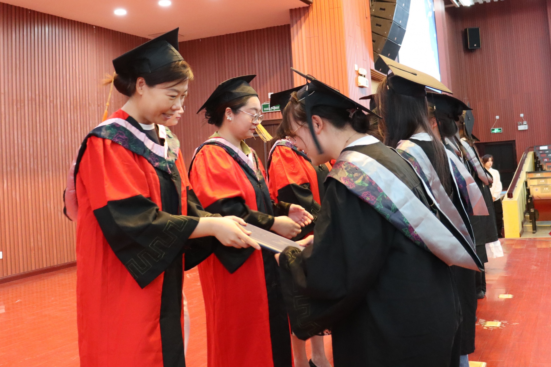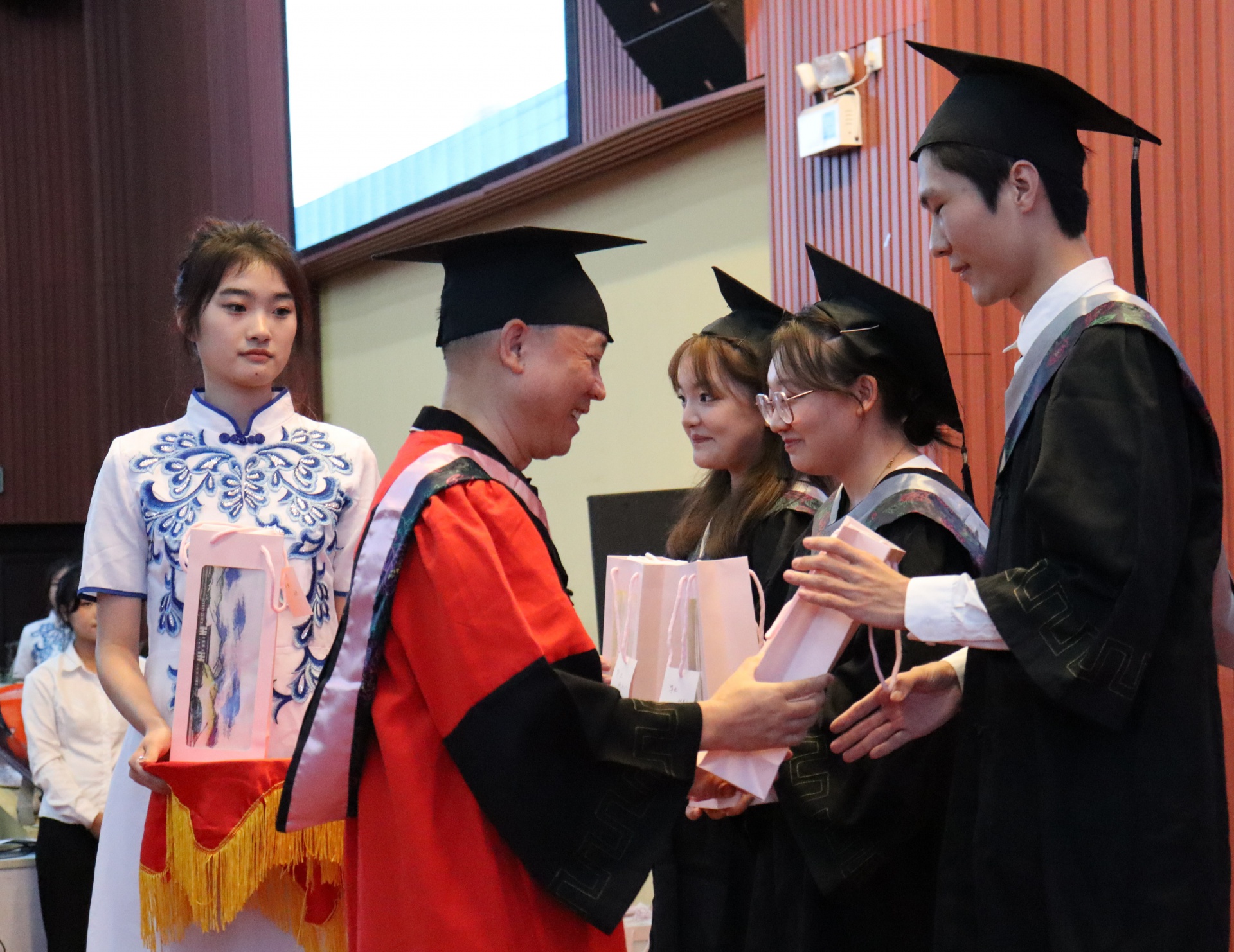 (刘思楠老师宣读优秀毕业生名单) (陈小勇院长为优秀毕业生颁发奖状) 仪式第三项,老师们为毕业生们授予学士学位证书并举行拨穗仪式。当一个个熟悉的名字被逐一被念出,他们纷纷起身,有条不紊地在颁奖台边排好队,等待领取属于他们的荣誉证书,每一位毕业生都心怀激动,眼中闪烁着对未来的期待与憧憬,因为他们知道,这是属于他们的高光时刻,要用自己最好的一面来留下美好的回忆。