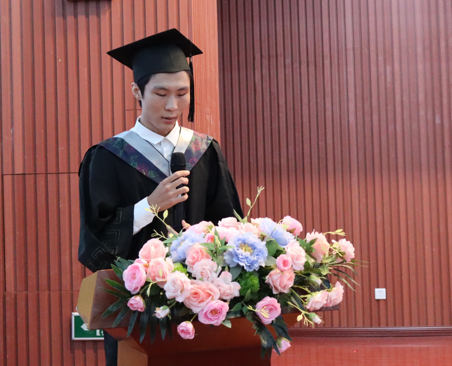 仪式第四项,毕业生代表黄家骏同学发表感言,他回顾了自己在校园的学习经历,表达了对母校的感激之情和对未来的憧憬,同时也鼓励所有毕业生要珍惜机会、勇往直前、不忘初心、牢记使命,为社会的发展贡献自己的力量,在人生的道路上不断前行。