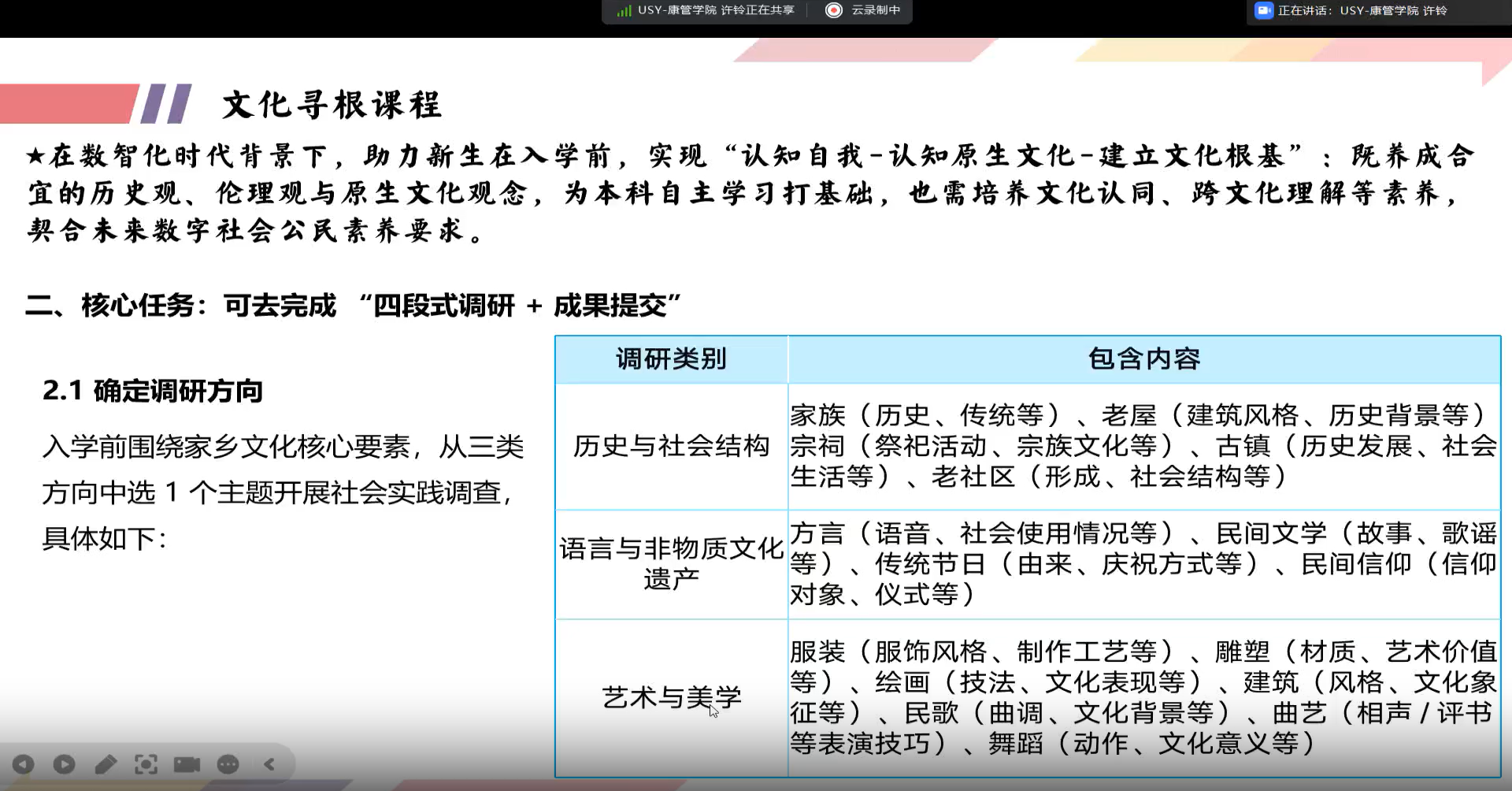 “数智化时代,文化根基是青年成长的‘定盘星’”。直播伊始,许铃老师点明文化寻根课程核心意义,即助力新生入学前完成“认知自我-认知原生文化-建立文化根基”成长闭环,培养文化认同与跨文化理解素养,为本科学习与未来发展奠基。课程有清晰实践路径,新生可围绕家乡文化核心要素,从“历史与社会结构”“语言与非物质文化遗产”“艺术与美学”三大类别为新生提供多元探索方向。调研遵循“寻找发现→观察呈现→演变溯源→现状评价”的“四段式”逻辑。成果呈现形式丰富,可提交调研报告、PPT,或制作3-5分钟短视频。优秀调研成果可作课外实践经历,为奖学金评选助力,兼顾成长价值与实际意义。