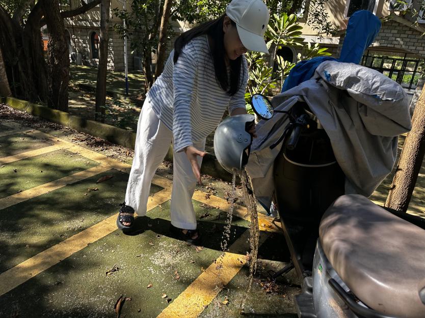本次行动以“清理积水、消除蚊虫孳生源”为核心任务,健康产业管理学院的责任区域涵盖公共区域和宿舍区域。在公共区域,学院重点对书安楼、书风馆及周边进行细致排查,清理各类易积水容器。实验中心主任刘思楠老师,实验教师姚晶鑫老师,对书安楼进行了巡查与清理。在室外区域,工作人员重点清理了桶、盆、轮胎、一次性饭盒、塑料包装袋等易积水容器,将其移至避雨处存放或翻转反扣;针对电动车相关区域,不仅清空了头盔内积水并妥善放置,还为电动车车衣折叠装袋封口,从源头阻断蚊虫滋生条件。