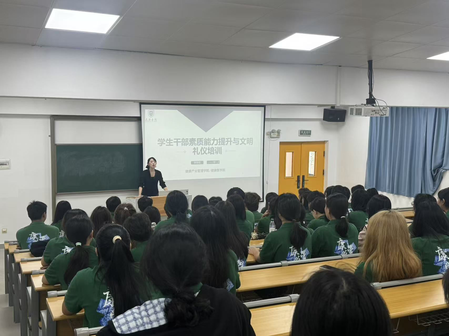 2025 年 11 月 19 日,健康医学院/健康产业管理学院举行 2025-2026 学年学生干部素质能力提升暨文明礼仪培训,旨在进一步提升 学生干部的综合素质与服务能力,强化责任意识与团队协作精神,并就校园文明礼仪进行培训。学院团委副书记李静茹老师主讲,全 体学生会干部参加培训。