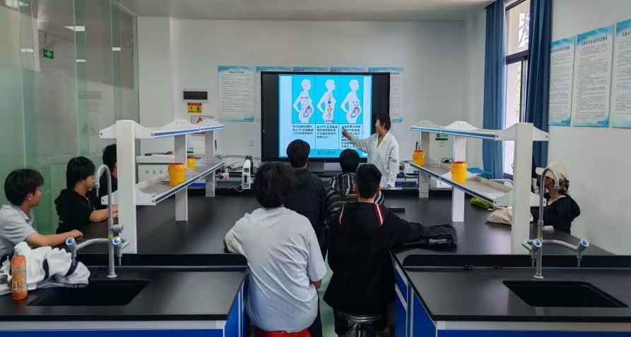 针对同学们的踊跃回应,李艳教授逐一进行专业解读:人的血型由基因决定,通常终身不变,仅在极少数特殊疾病或治疗后可能出现暂时变化,特别在临床检验工作中一定要引起注意;同型血输注虽为临床基础原则,但仍需通过交叉配血试验排除亚型或抗体干扰,一定要做血型亚型的测定,同型输血并非绝对安全;O型血并非“万能输血者”,其血浆中含有的抗A、抗B抗体可能引发受血者免疫反应,仅紧急情况下可少量输注红细胞;AB型血也不是“万能受血者”,输入其他血型血浆同样存在不良反应风险;直系亲属之间直接输血易引发移植物抗宿主病,临床中早已明确禁止,这一解读颠覆了不少新生的固有认知。理论讲解结束后,实操环节正式开启。在教授和实验员的指导下,新生们分组动手进行血型测定。从准备试剂、采集指尖血到显微镜下观察红细胞凝集反应,大家小心翼翼地完成每一个步骤实验。