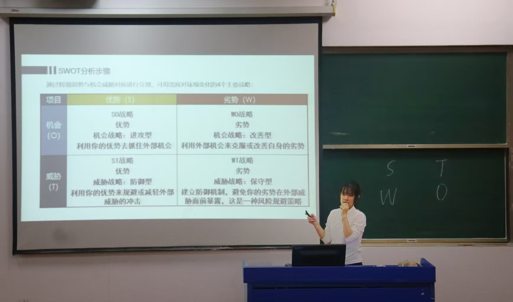 在案例解析环节,王老师详细拆解了小猪妖的SWOT模型:其学习能力强、观察力敏锐等特质构成核心优势,认知局限、技能单一则是明显劣势;下山接触外界、危机中逃离浪浪山属于重要机会,而行业风险高、内部压榨等问题构成潜在威胁。基于这一分析,王老师进一步推导得出SO(进攻型)、WO(改善型)、ST(防御型)、WT(保守型)四种策略,并结合大学生群体特点,给出了“以优势捕捉行业机会”“借外部资源弥补技能短板”“规避职业赛道潜在风险”等具体建议。