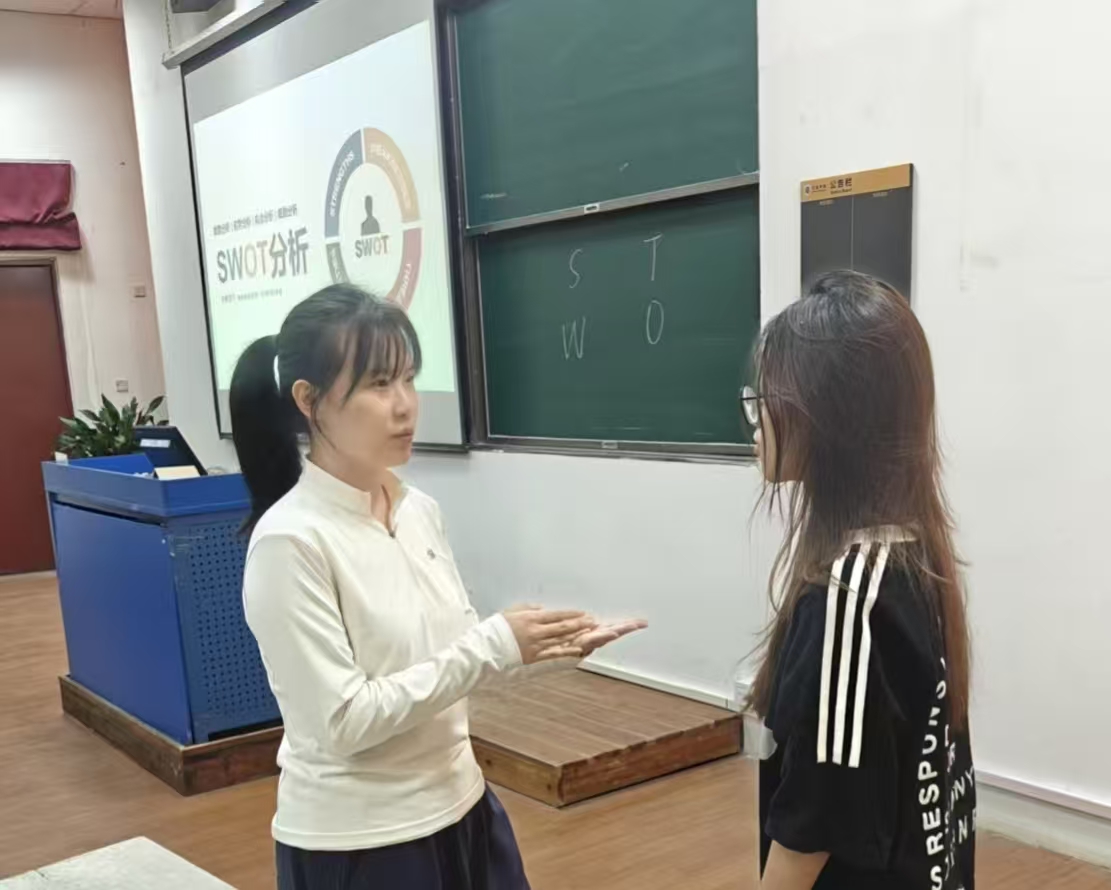 讲座结束后,不少同学围绕自身职业困惑向王老师咨询,王老师结合学生的个体情况,现场开展了“一对一”指导,从SWOT分析的实际应用到具体职业方向的适配性,为学生提供了个性化的规划建议。