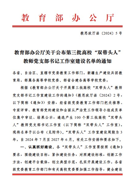 根据《教育部办公厅关于开展第三批高校“双带头人”教师党支部书记工作室建设工作的通知》(教思政厅函〔20242号)安排,经省级党委教育工作部门把关推荐、专家评审、教育部党的建设和全面从严治党工作领导小组成员单位集中审议、结果公示,遴选产生100个第三批高校“双带头人”教师党支部书记工作室(以下简称“双带头人”工作室),并于2024612日发布《教育部办公厅关于公布第三批高校“双带头人”教师党支部书记工作室建设名单的通知》(教思政厅函〔20245号)。在公布的100个“双带头人”工作室名单中,三亚学院健康产业管理学院教工党支部获批入选。