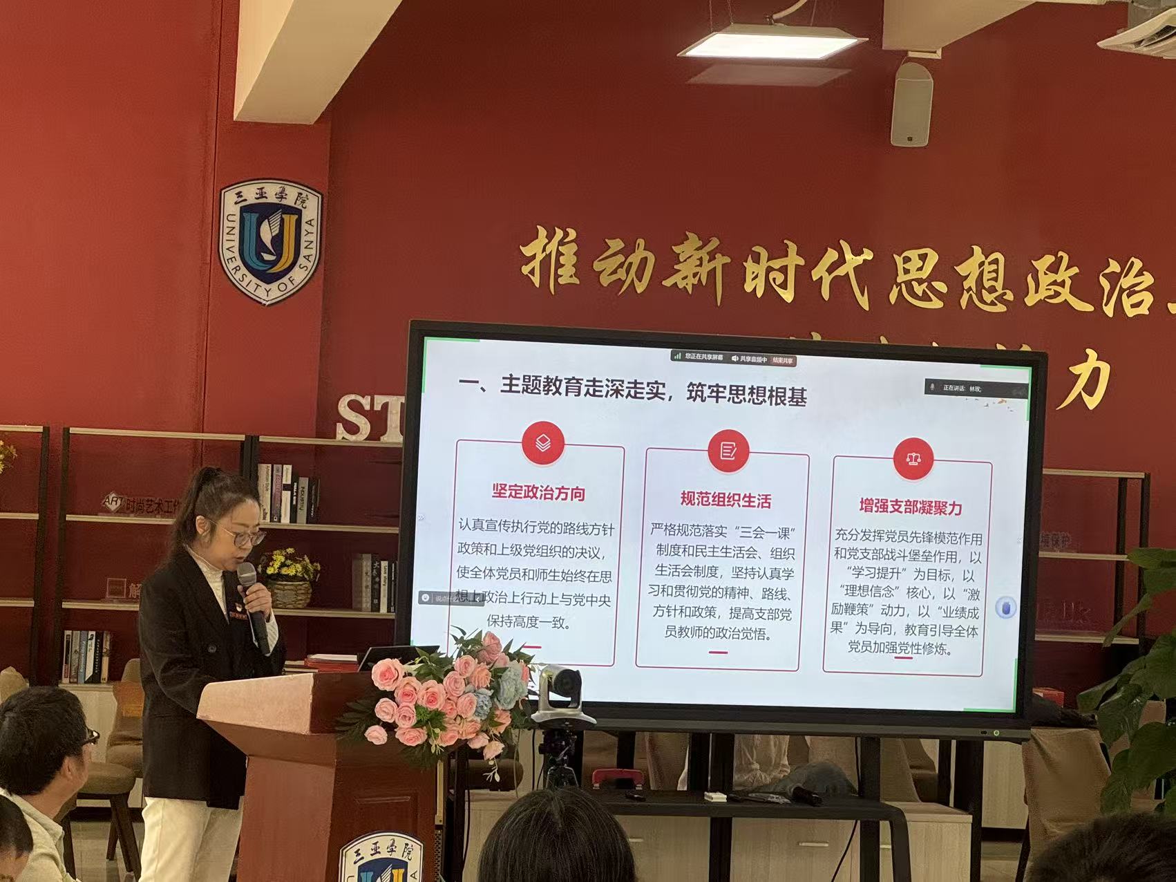 会上,健康产业管理学院教工党支部书记李卉妍围绕建设目标,从政治建设深化、组织能力提升、党建与业务融合、示范作用发挥等方面,详细汇报了工作室建设一年来的阶段性成果。建设一年来,教工党支部书记工作室立足健康产业特色,构建三个三党建创新工作模式,建立从融合到引领的“医领双翼,三色协同”工作室(三色馆),即以红色(党建引领)、绿色(生命关怀)、蓝色(智慧创新)为基础,凝心聚力,构建高层次医学人才培养体系注重培养医学生的临床实践能力、科研创新能力和人文素养。党支部号召工作室全体党员同志借助红色热色智慧的启迪,为医学生提供全方位的成长助力,推动学院核心业务情的感召、绿色生命的呵护、蓝”兰院印记的党建品牌,深度推进产教融合,全方位服务于学校整体发蓬勃发展,打造具有鲜明三亚展战略,以实际行动传承和弘扬琼崖精神,为社会输送德才兼备的医学栋梁,契合国家对高素质医学人才培养的需求。同时,汇报也客观分析了成果凝练不足、示范辐射范围有限等现存问题。