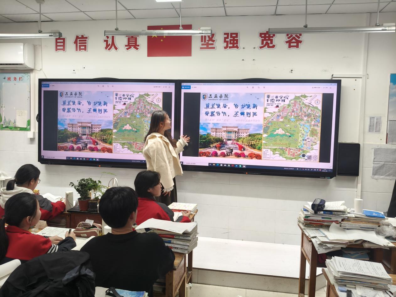 此次宣讲活动中,师紫嫣以毕业学姐的身份,为河北郑口中学的高三学弟学妹带来了一场全面细致的院校宣讲。她首先以视频播放、校园手绘地图展示为开场,向学弟学妹展现北纬18°滨海热带园林式校园的风貌,介绍了椰林、图书馆、超算中心、泳池等校园配套设施,让同学们直观感受特色校园环境。